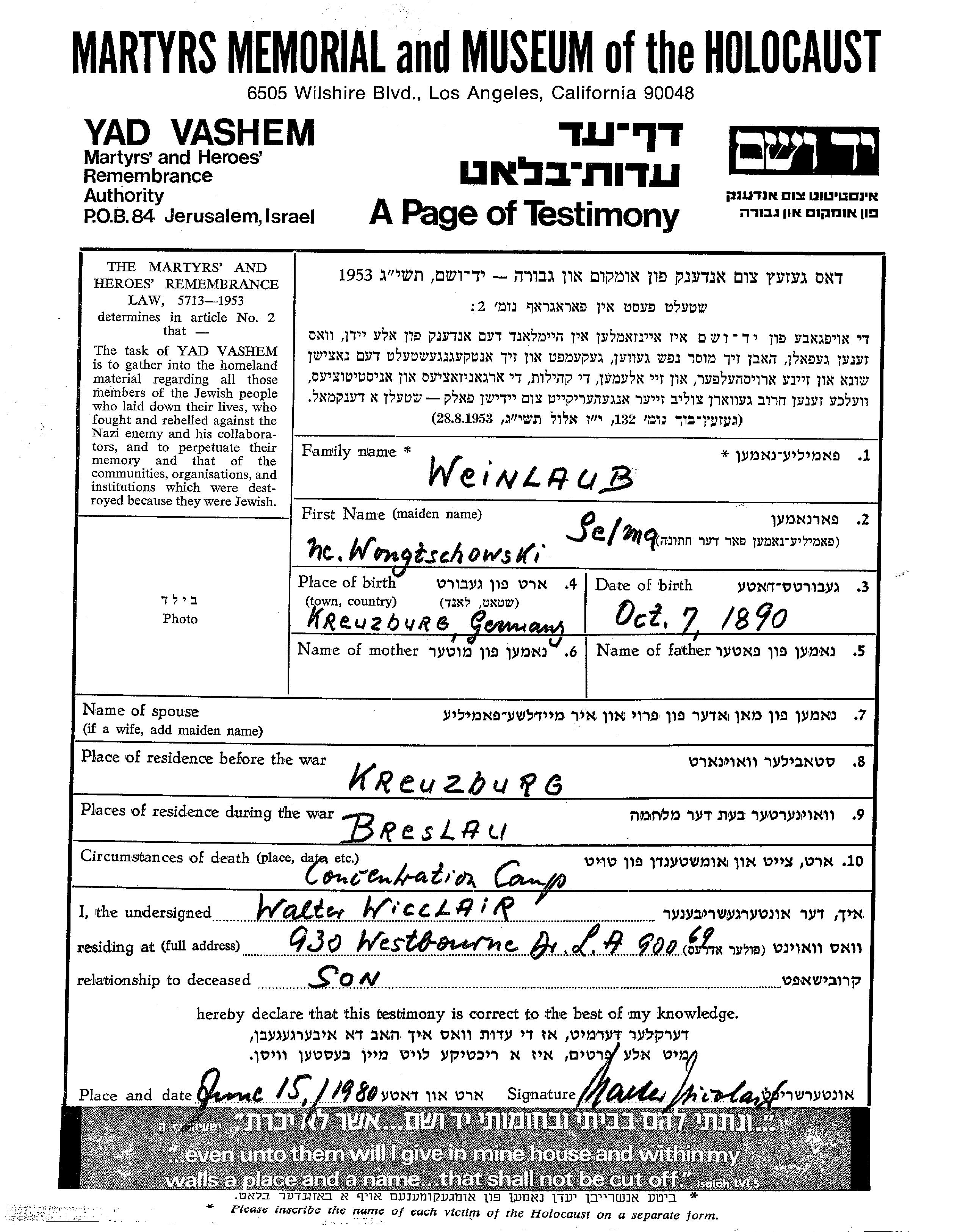| Weinlaub | Selma | 1890 | Kreuzburg, Alemania | Hoja de Testimonio |