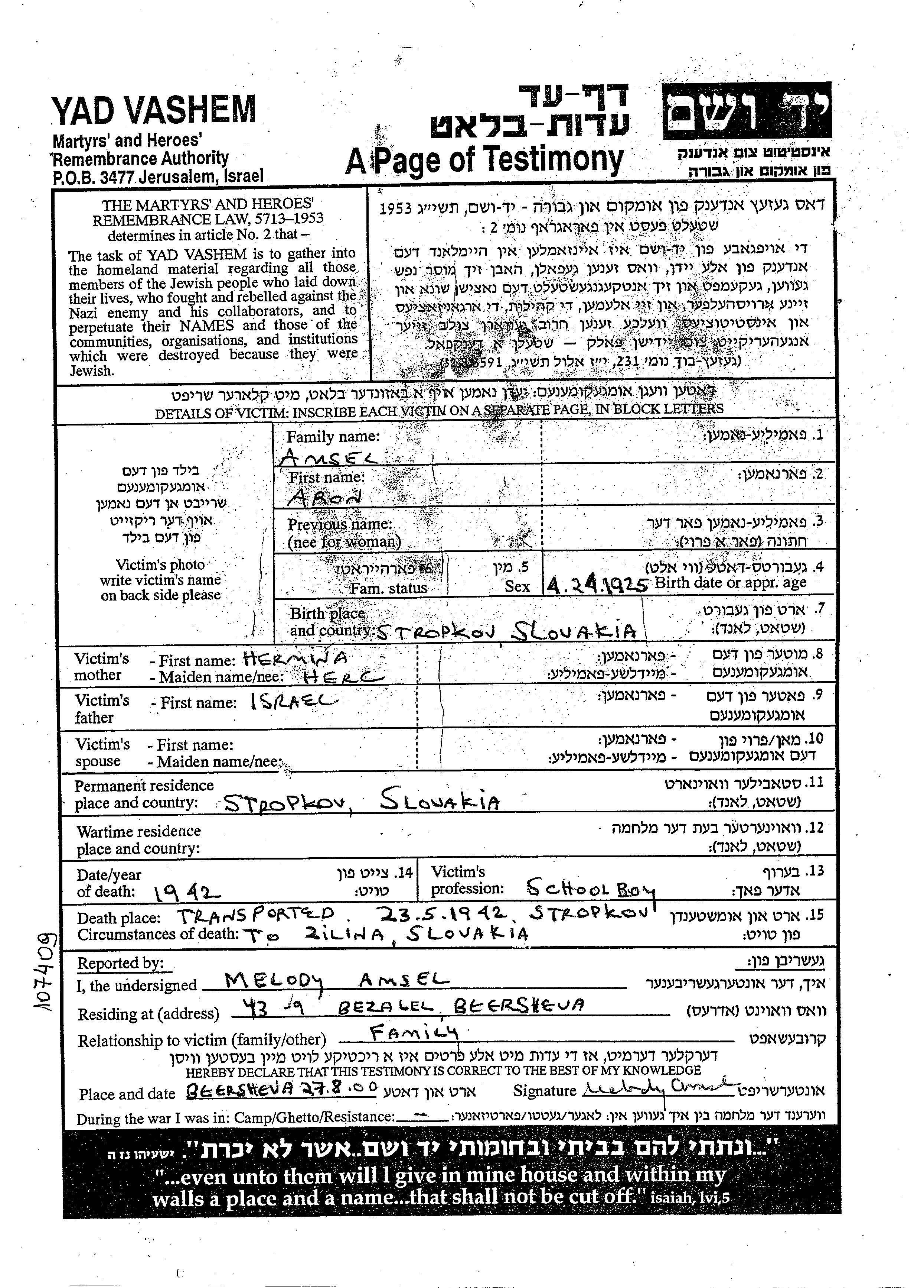 | Amsel | Aron | 1925 | Stropkov, Checoslovaquia | Hoja de Testimonio |