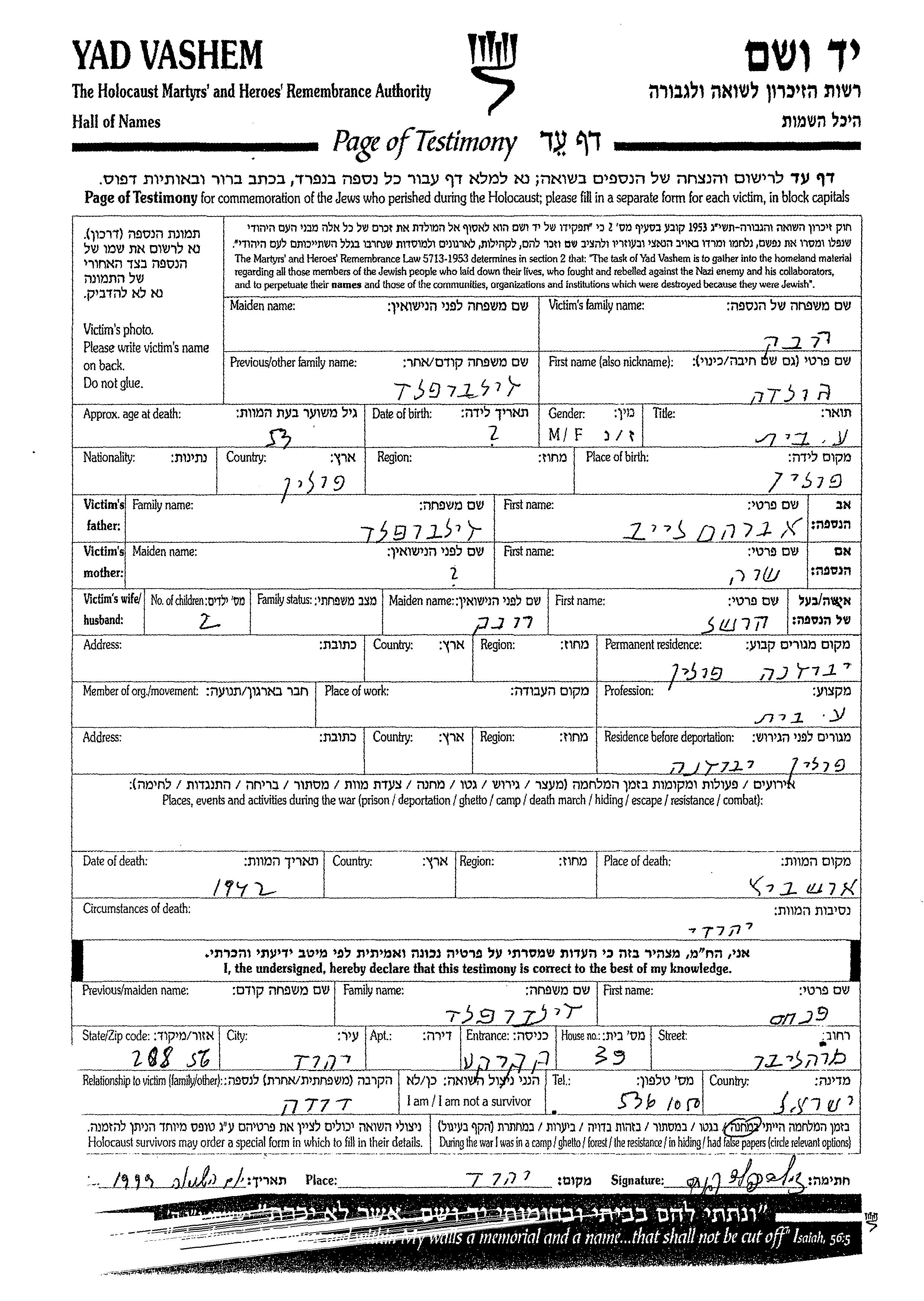 Yad Vashem - Colección conmemorativa de Hojas de Testimonio