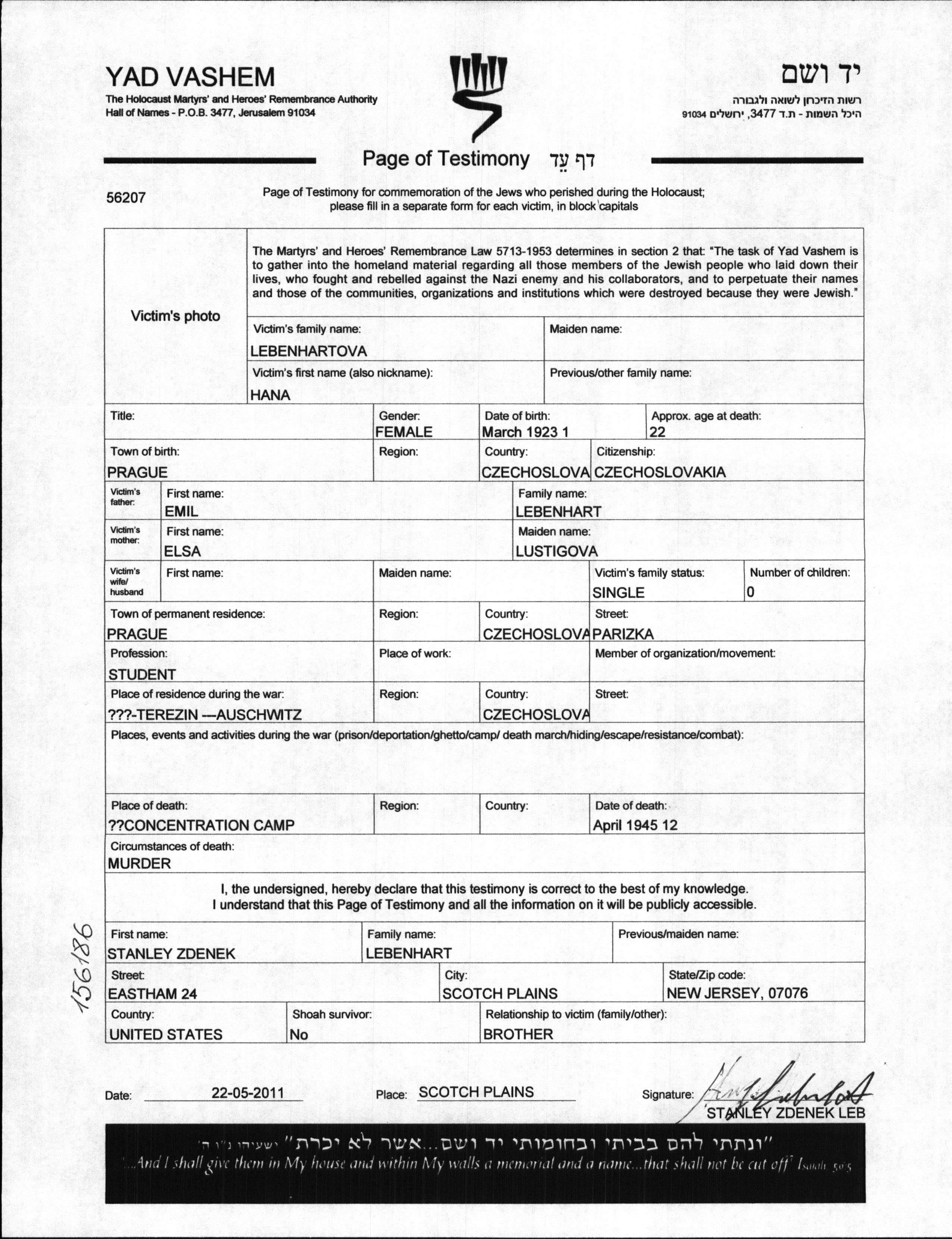 Hana Lebenhartova nació en Prague, Checoslovaquia en 1923, hija de Emil y Elsa apellido de soltera Lustigova. Era Estudiante y Solteroa. Antes de la segunda guerra mundial vivía en Prague, Checoslovaquia. Durante la guerra estuvo en Theresienstadt, Checoslovaquia. Hana fue asesinada durante la Shoá. Lugar de la muerte: desconocido en 12/04/1945.
