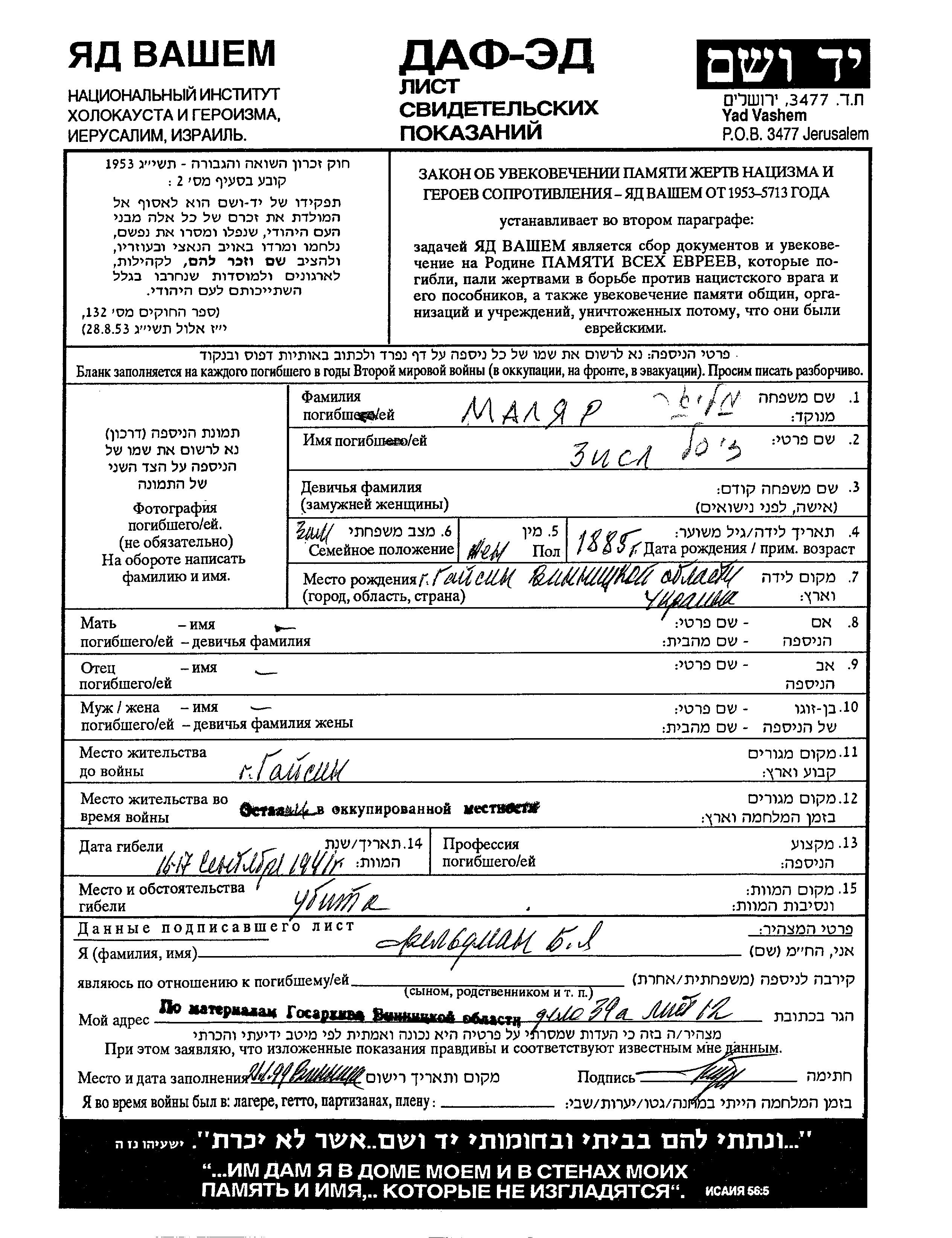 Malyar Zisl 1885 Gaisin, Ucrania (URSS) Hoja de Testimonio