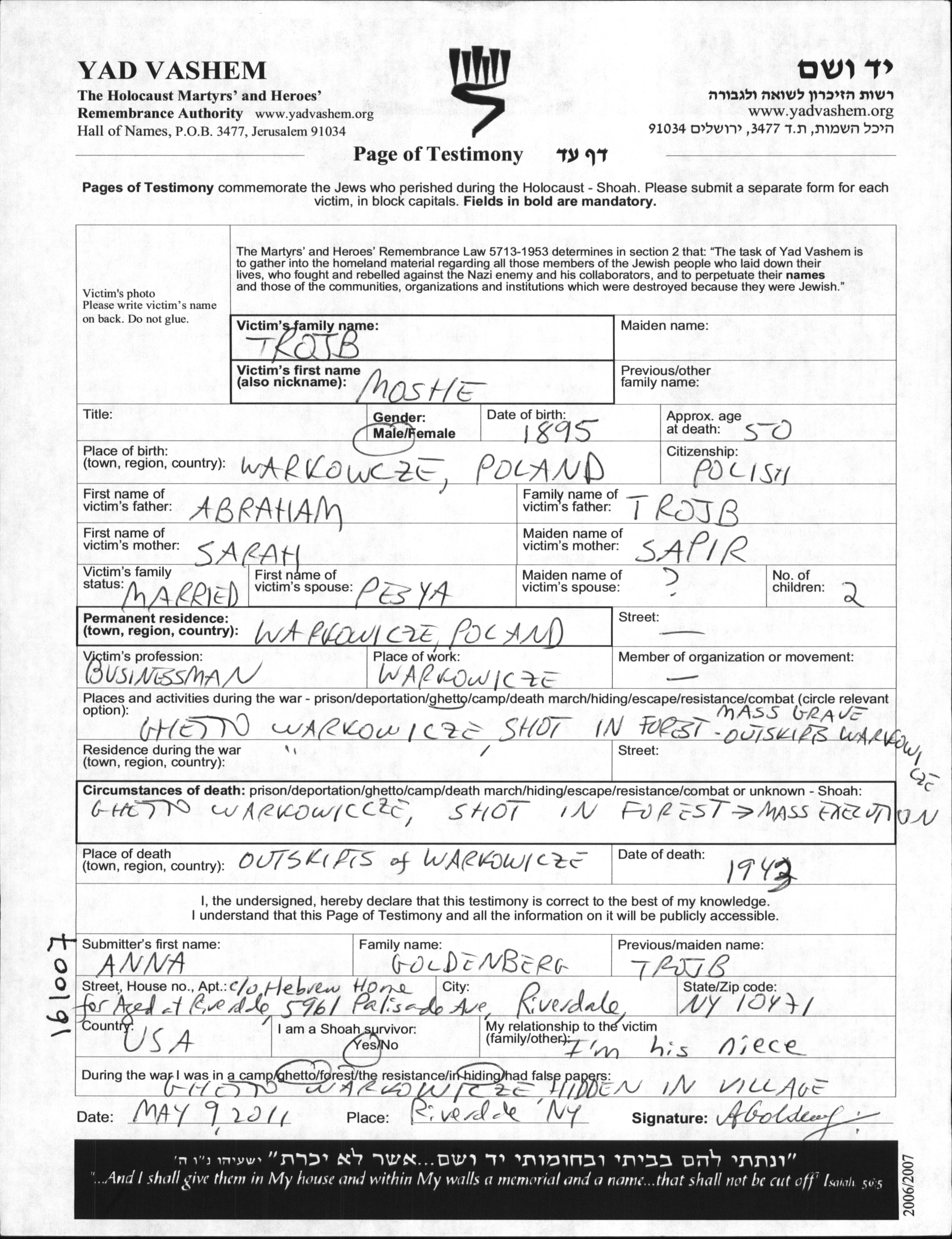 Trojb Moshe 1895 Warkowicze, Polonia Hoja de Testimonio