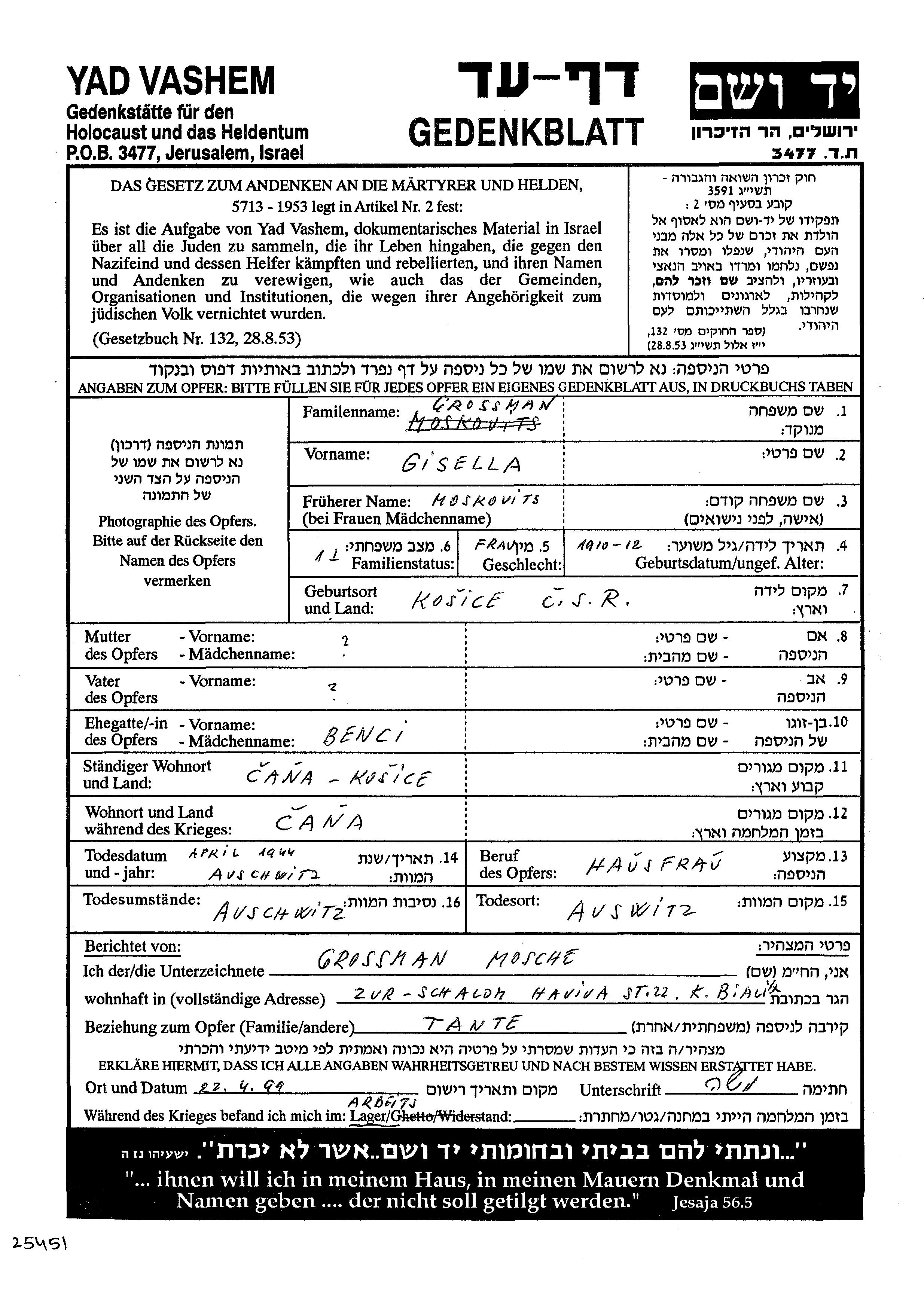 Gisella Grossman apellido de soltera Moskovits nació en Kosice, Checoslovaquia en 1910. Era Ama de casa y casada con Benci. Antes de la segunda guerra mundial vivía en Cana, Checoslovaquia. Durante la guerra estuvo en Cana.