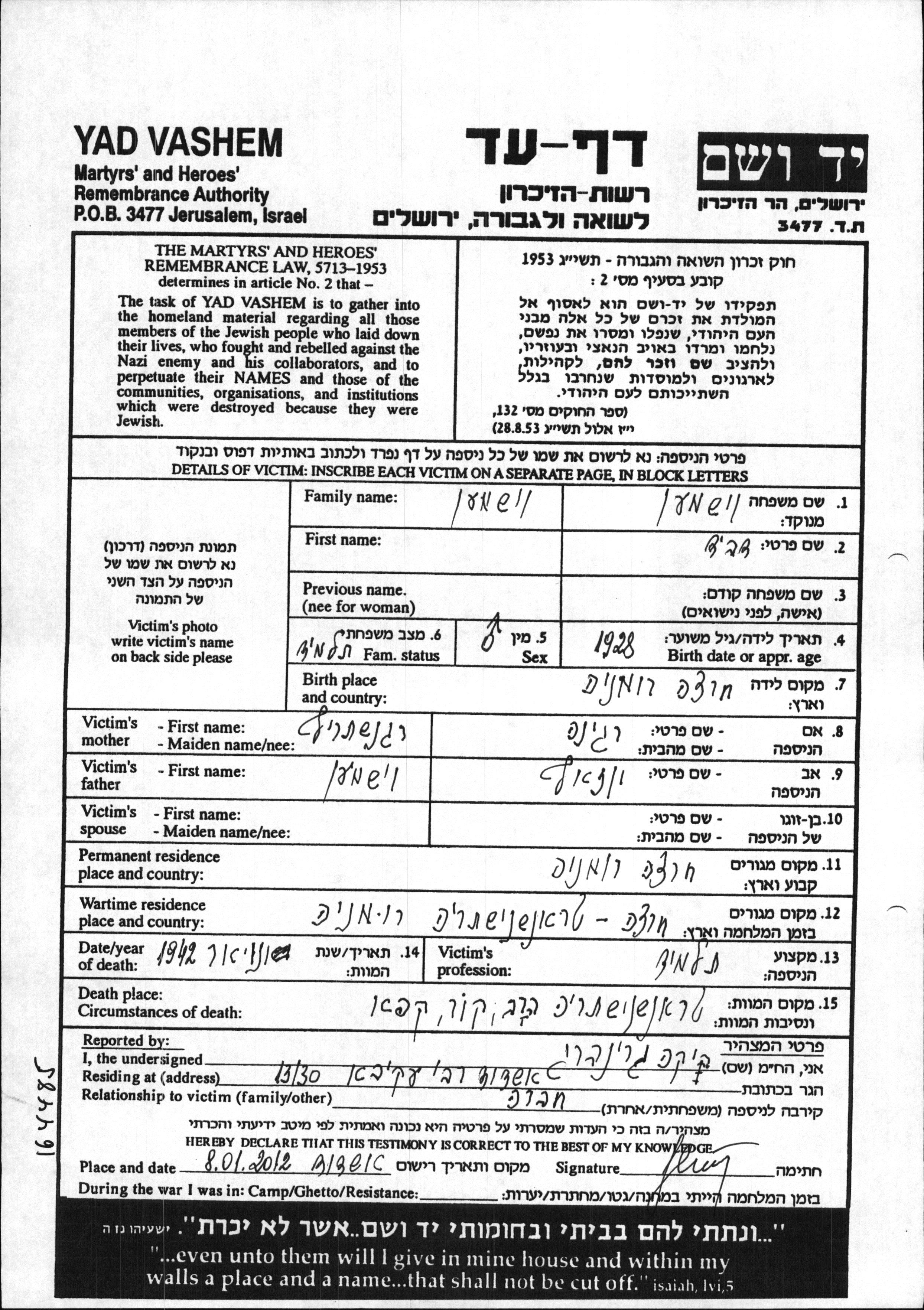 Vishman David 1928 Herca, Rumania Hoja de Testimonio