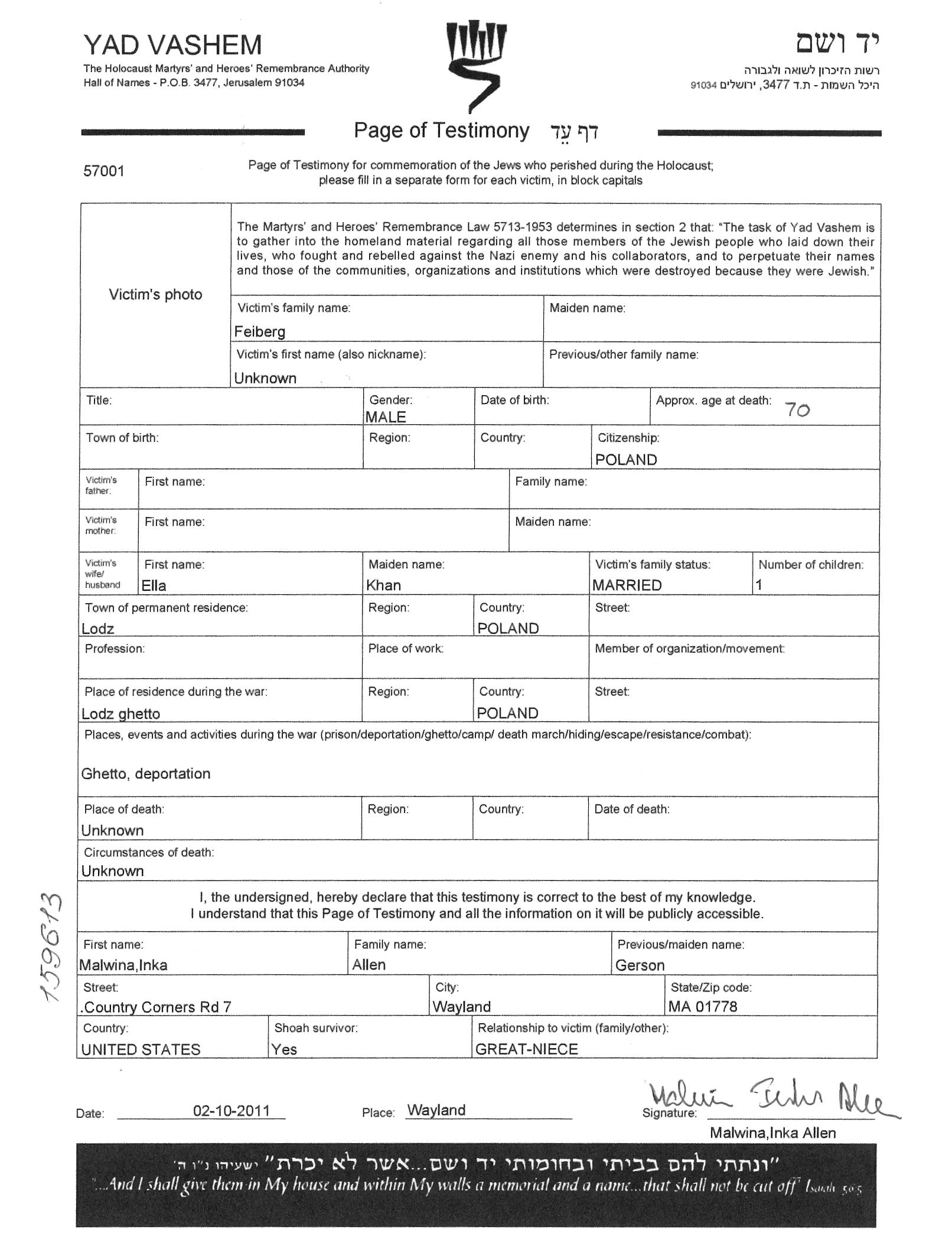 nombre desconocido Feiberg. Era Casado con Ella apellido de soltera Khan. Antes de la segunda guerra mundial vivía en Lodz, Polonia. Durante la guerra estuvo en Lodz, Polonia.