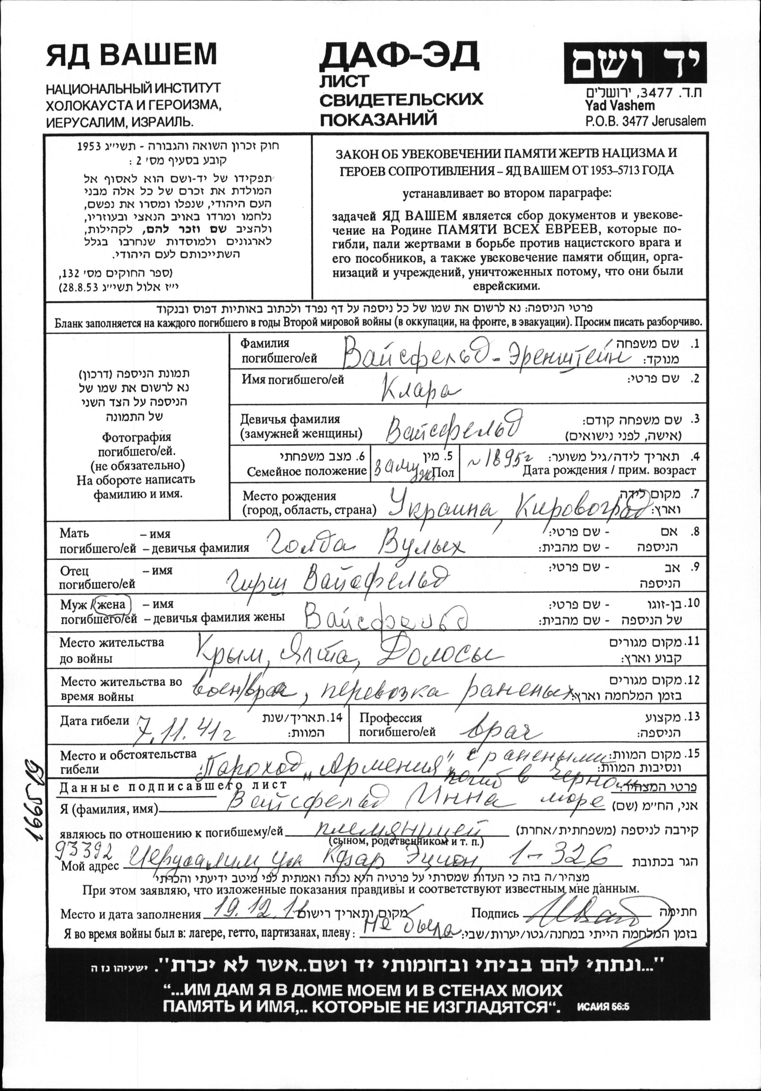 Klara Erenshtein apellido de soltera Vaysfeld nació en Kirovograd, Ucrania (URSS) en 1895, hija de Girsh y Golda apellido de soltera Vulykh. Era Médico/a y casada. Antes de la segunda guerra mundial vivía en Yalta, Rusia (URSS). Durante la guerra estuvo en las fuerzas armadas soviéticas. Klara murió en servicio militar. Lugar de la muerte: Black Sea en 07/11/1941.