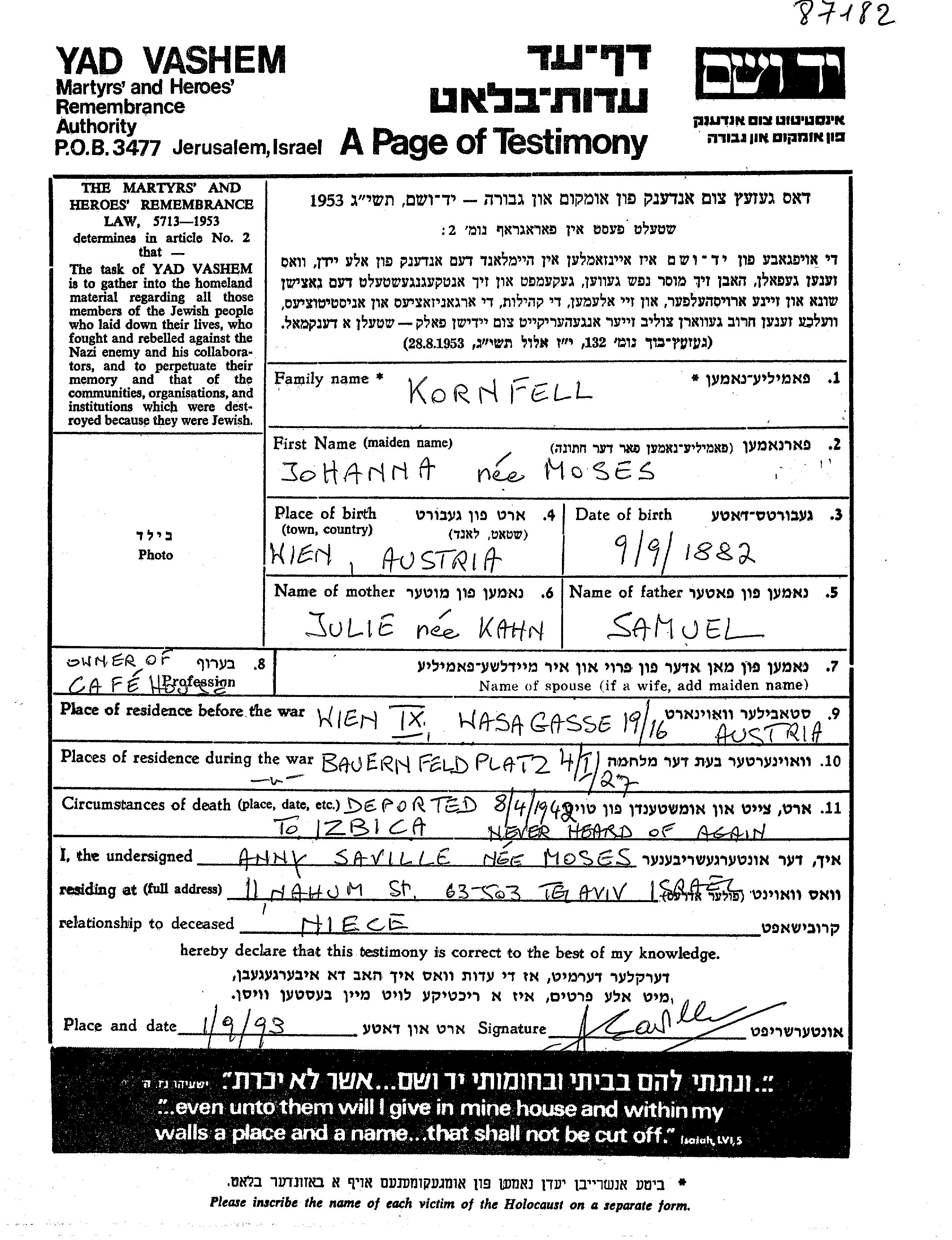 Kornfell | Johanna | 1882 | Wien, Austria | Hoja de Testimonio |