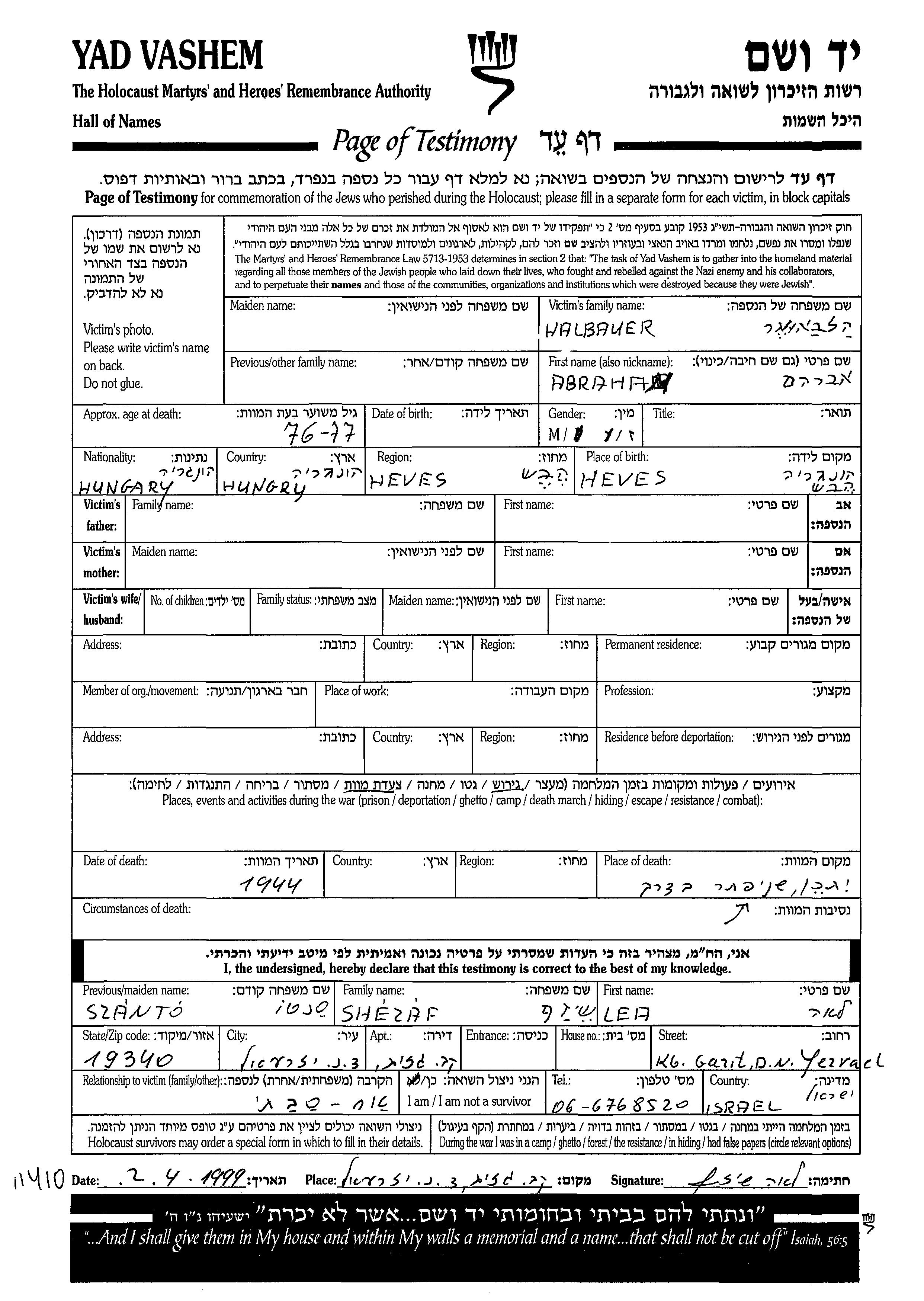 Halbauer Abraham lugar desconocido, Hoja de Testimonio