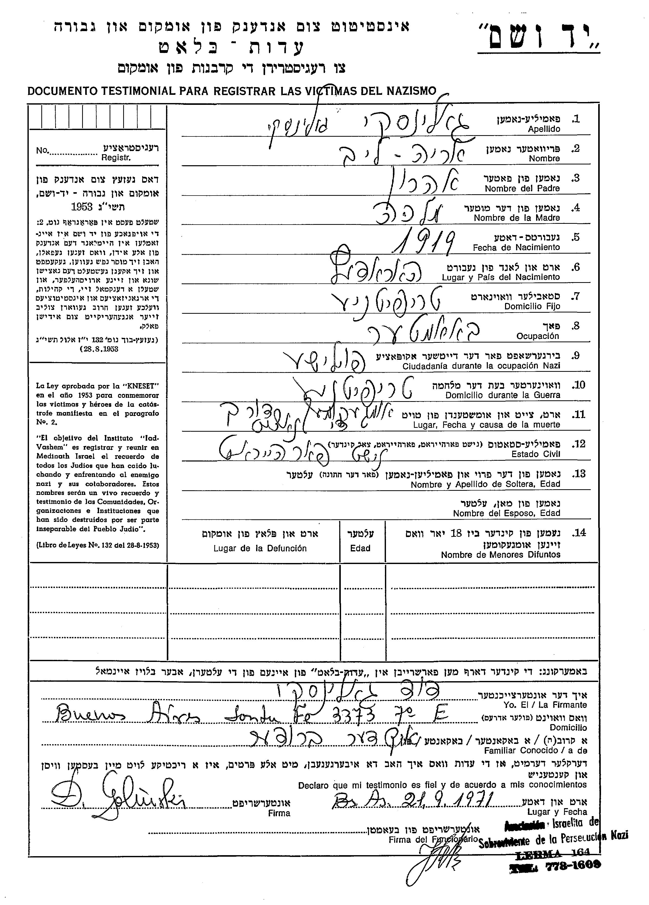 Golinski Arie Leib 1919 Tryputnia, Polonia Hoja de Testimonio