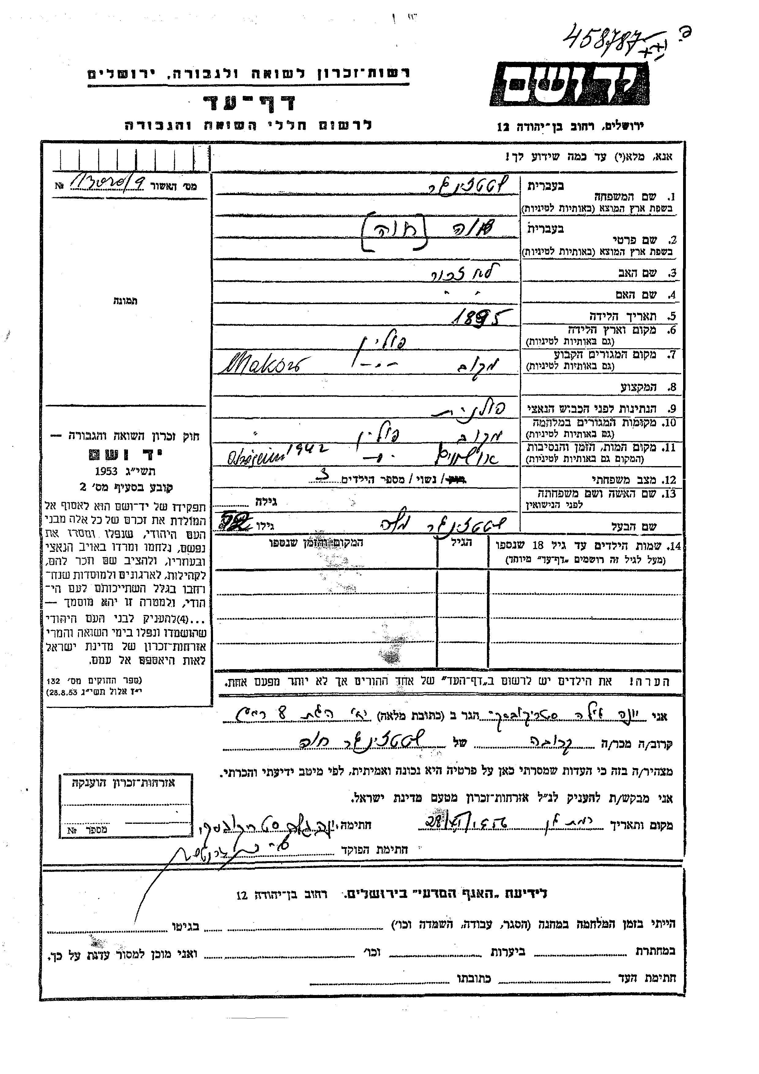 Shtatzinger Khava 1895 Maków, Polonia Hoja de Testimonio