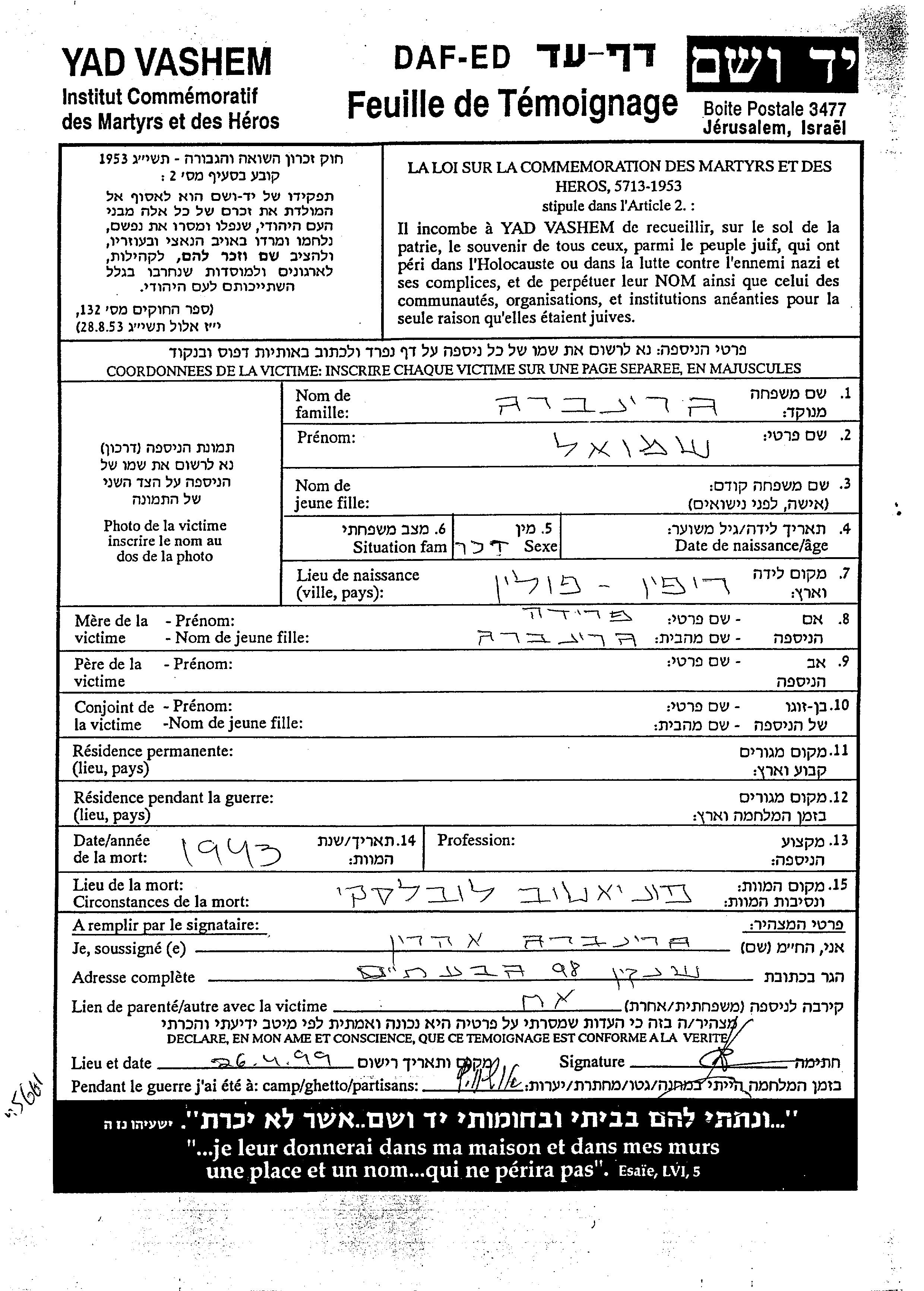 Grinberg Shmuel lugar desconocido, Hoja de Testimonio