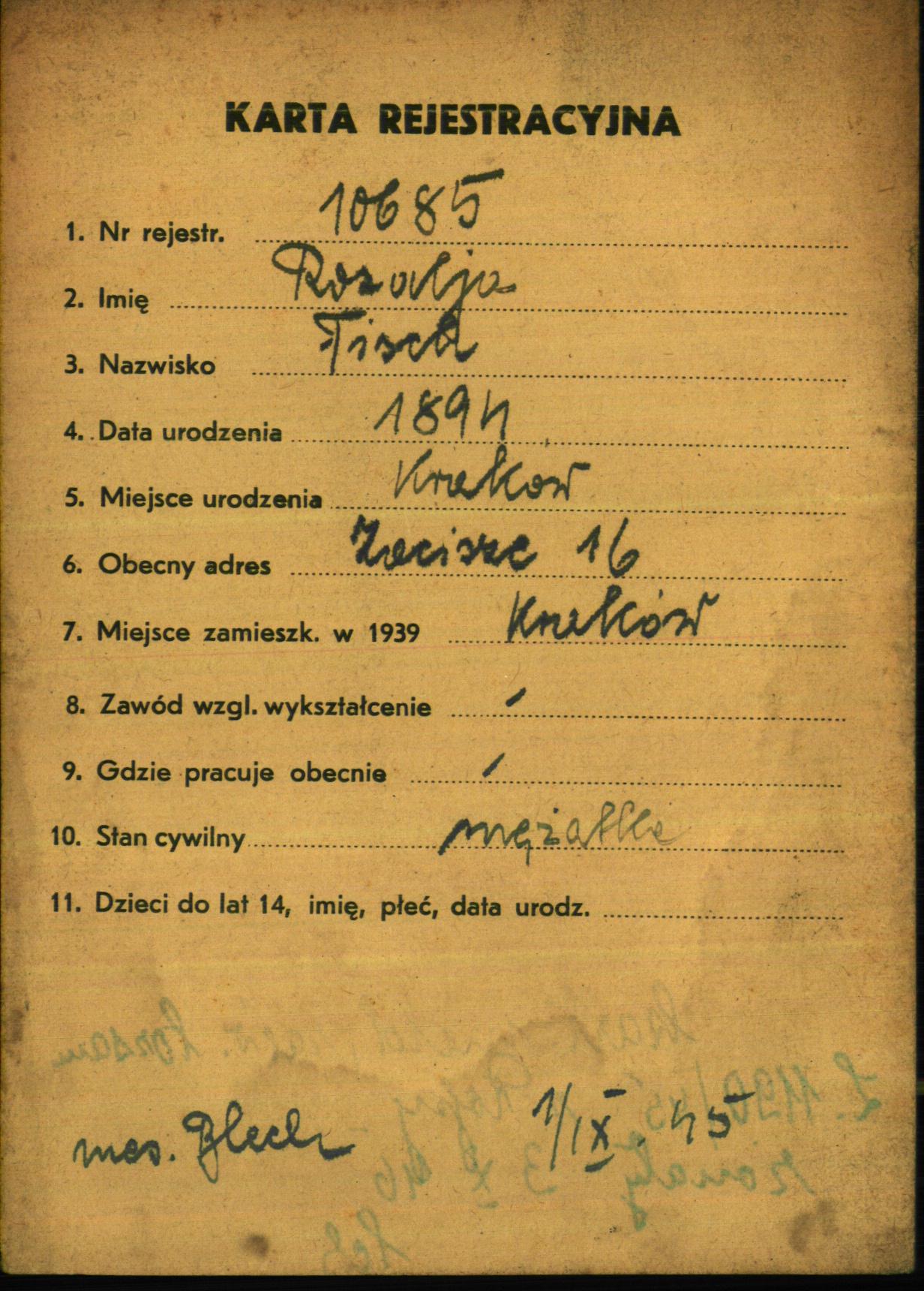 Rozalja Fisch nació en Krakow, Polonia en 1894. Era casada. Antes de la segunda guerra mundial vivía en Krakow, Polonia.