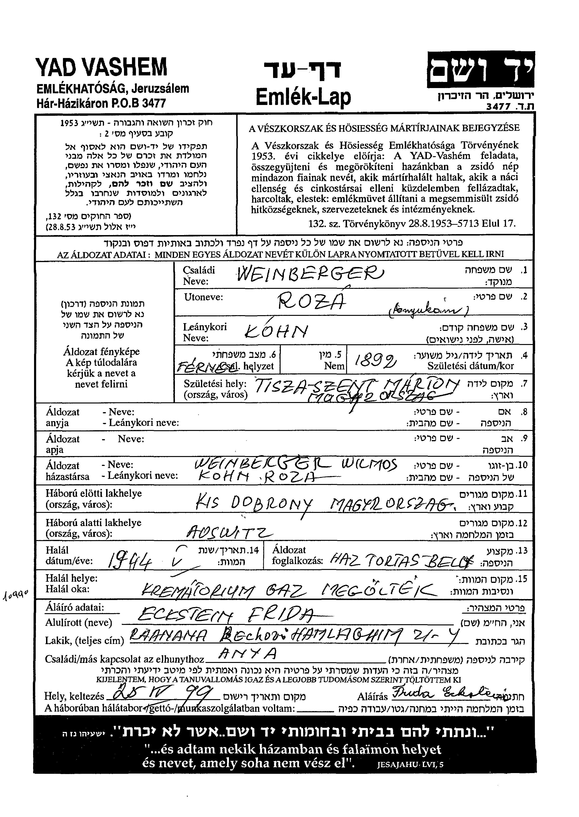 Roza Weinberger apellido de soltera Kohn nació en Tiszaszentmarton, Hungría en 1892. Era Ama de casa y casada con Wilmos. Antes de la segunda guerra mundial vivía en Kisdobrony, Checoslovaquia. Durante la guerra estuvo en Auschwitz, Polonia. Roza fue asesinada durante la Shoá. Lugar de la muerte: Auschwitz, Polonia en 05/1944.