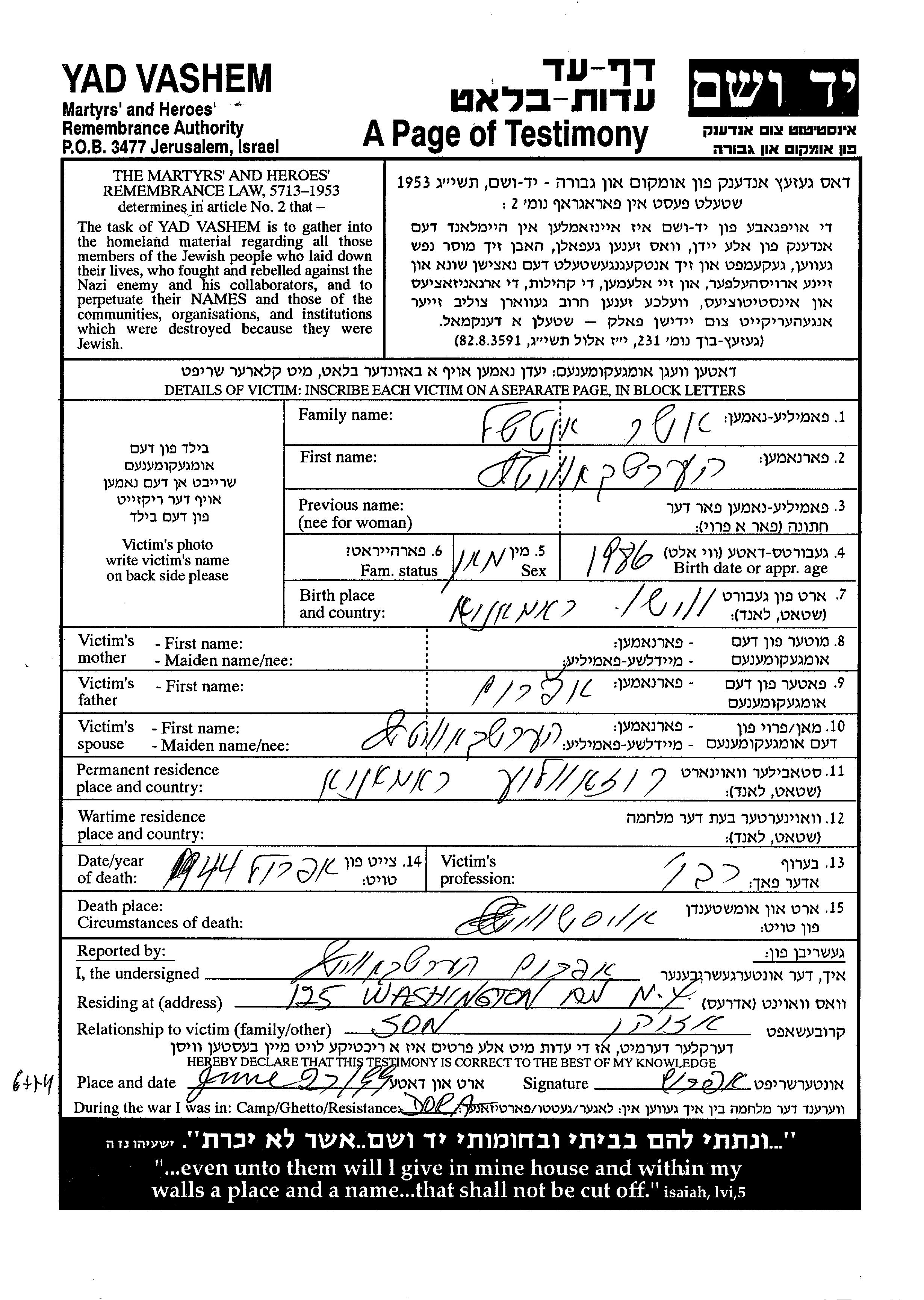 Yad Vashem - Colección conmemorativa de Hojas de Testimonio