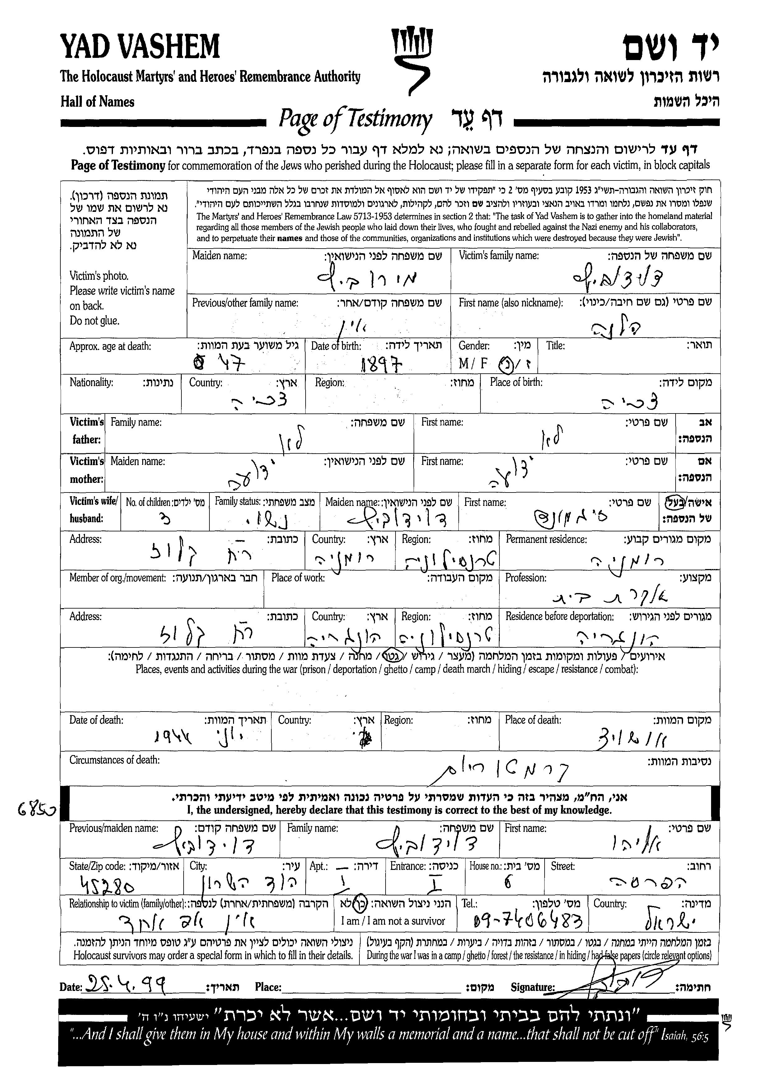 Helena Davidovitz apellido de soltera Mirovitz nació en Checoslovaquia en 1897. Era Ama de casa y casada con Zigmund. Antes de la segunda guerra mundial vivía en Transylvania, Rumania. Durante la guerra estuvo en Transylvania, Rumania. Helena fue asesinada durante la Shoá. Lugar de la muerte: Auschwitz, Polonia en 06/1944.