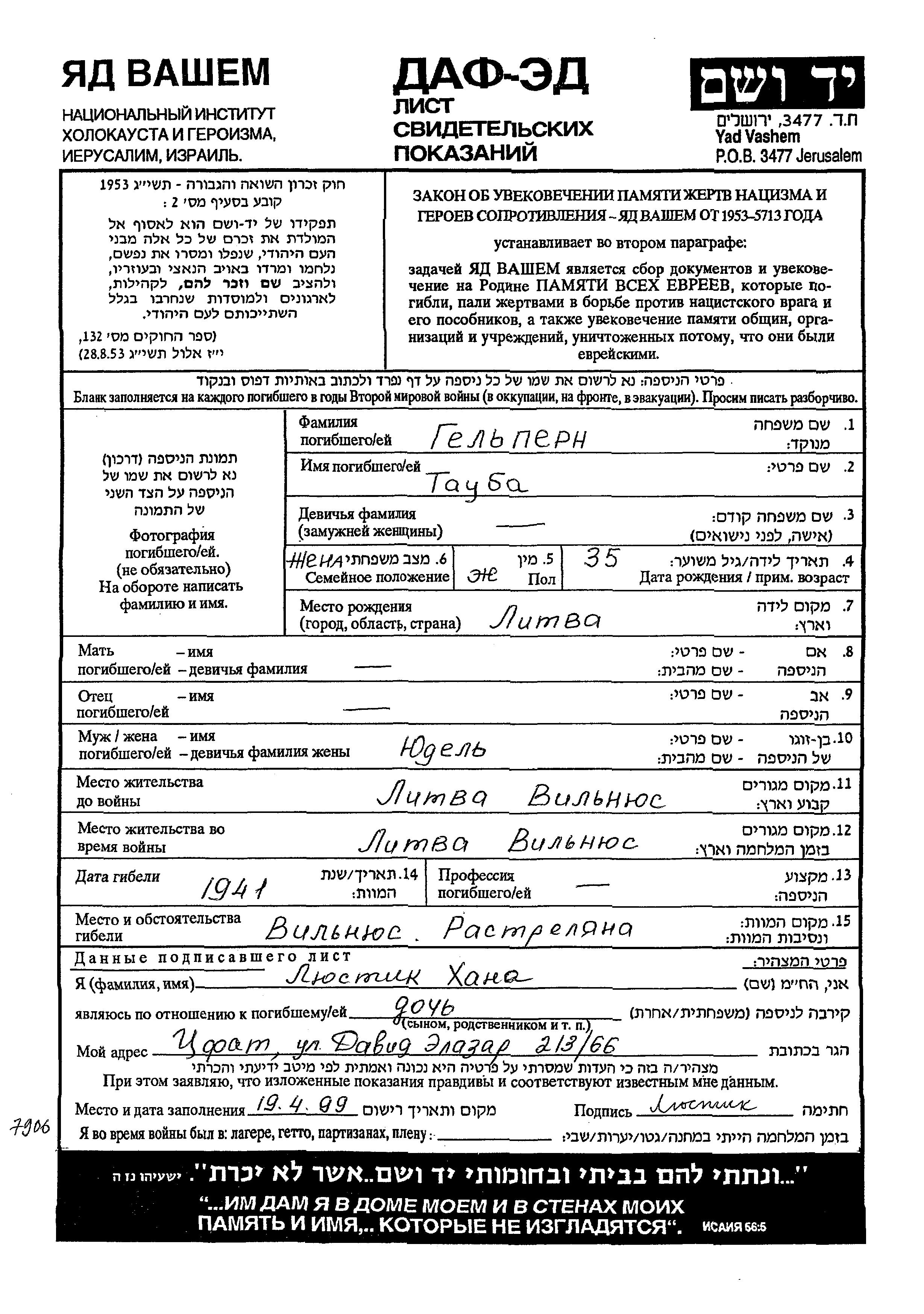 Gelpern Tauba Vilnius, Pologne Feuille de témoignage