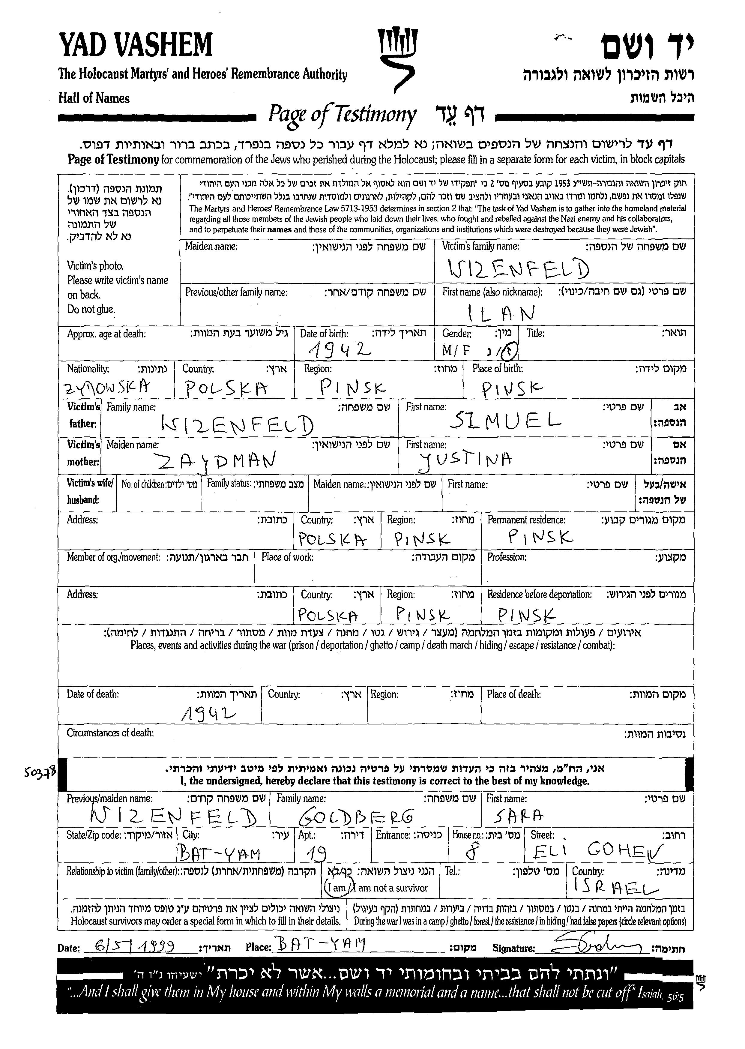 Wizenfeld Ilan 1942 Pinsk, Pologne Feuille de témoignage
