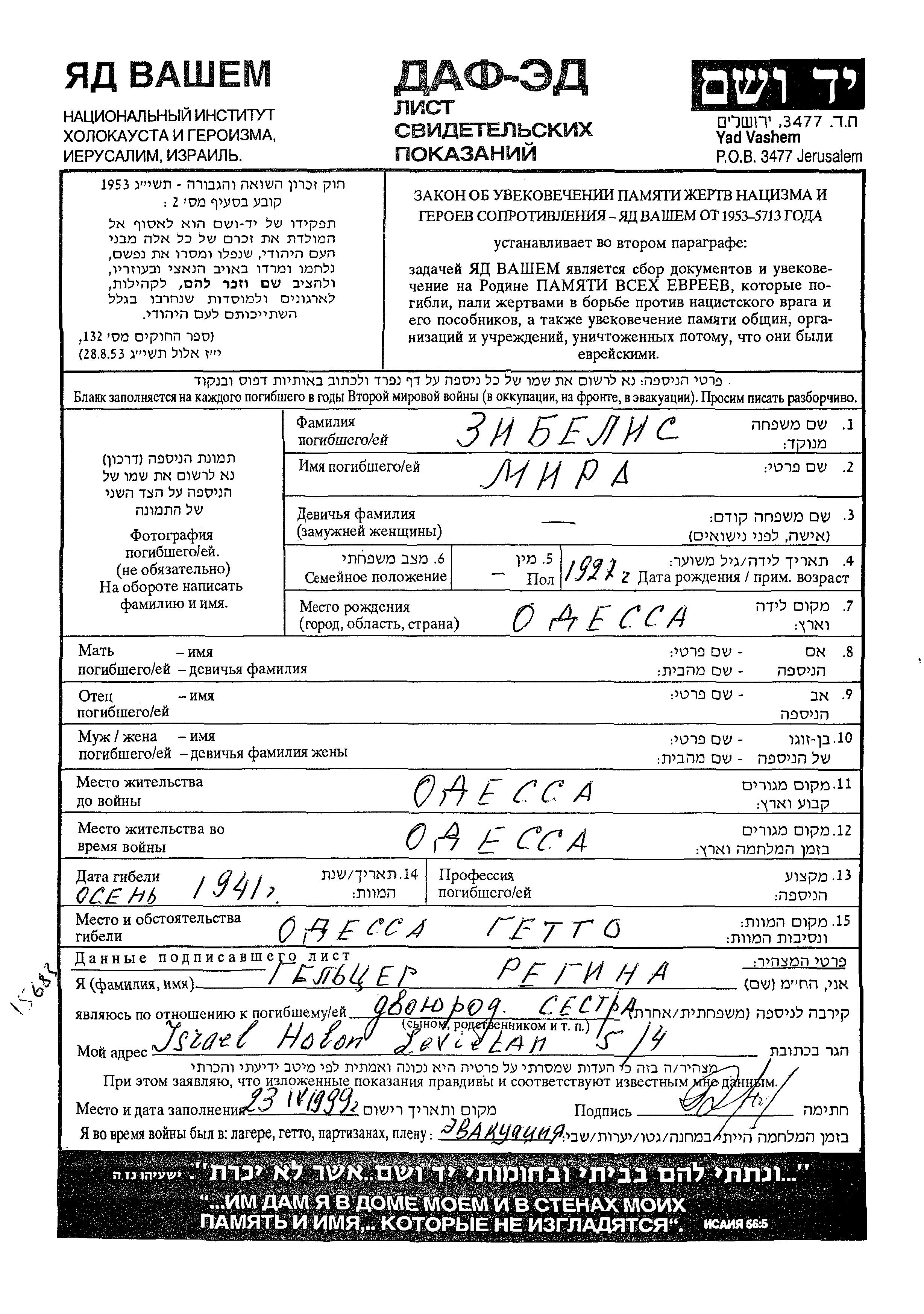 Yad Vashem - Pages of Testimony Names Memorial Collection