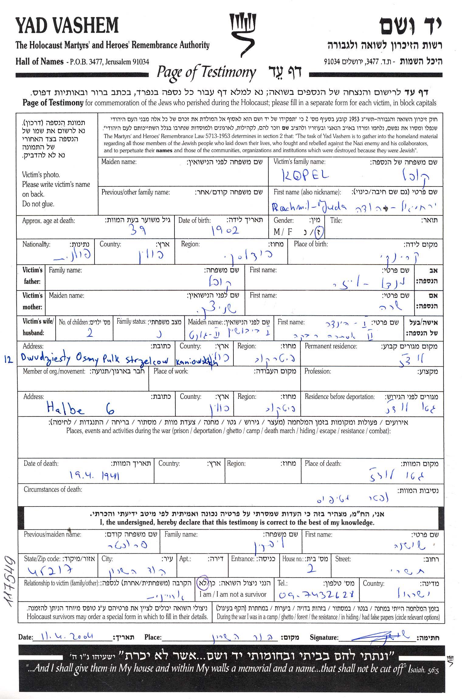 Kopel Rachmil Juda 1902 Lodz, Pologne Feuille de témoignage