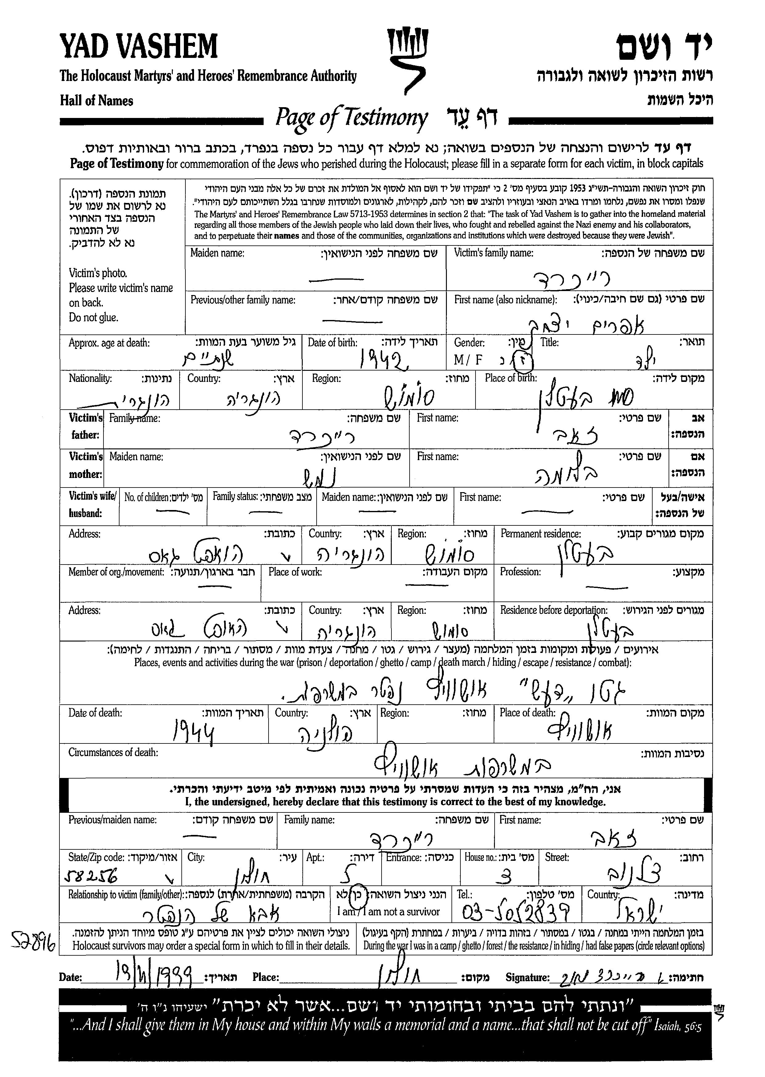 Yad Vashem - Pages of Testimony Names Memorial Collection