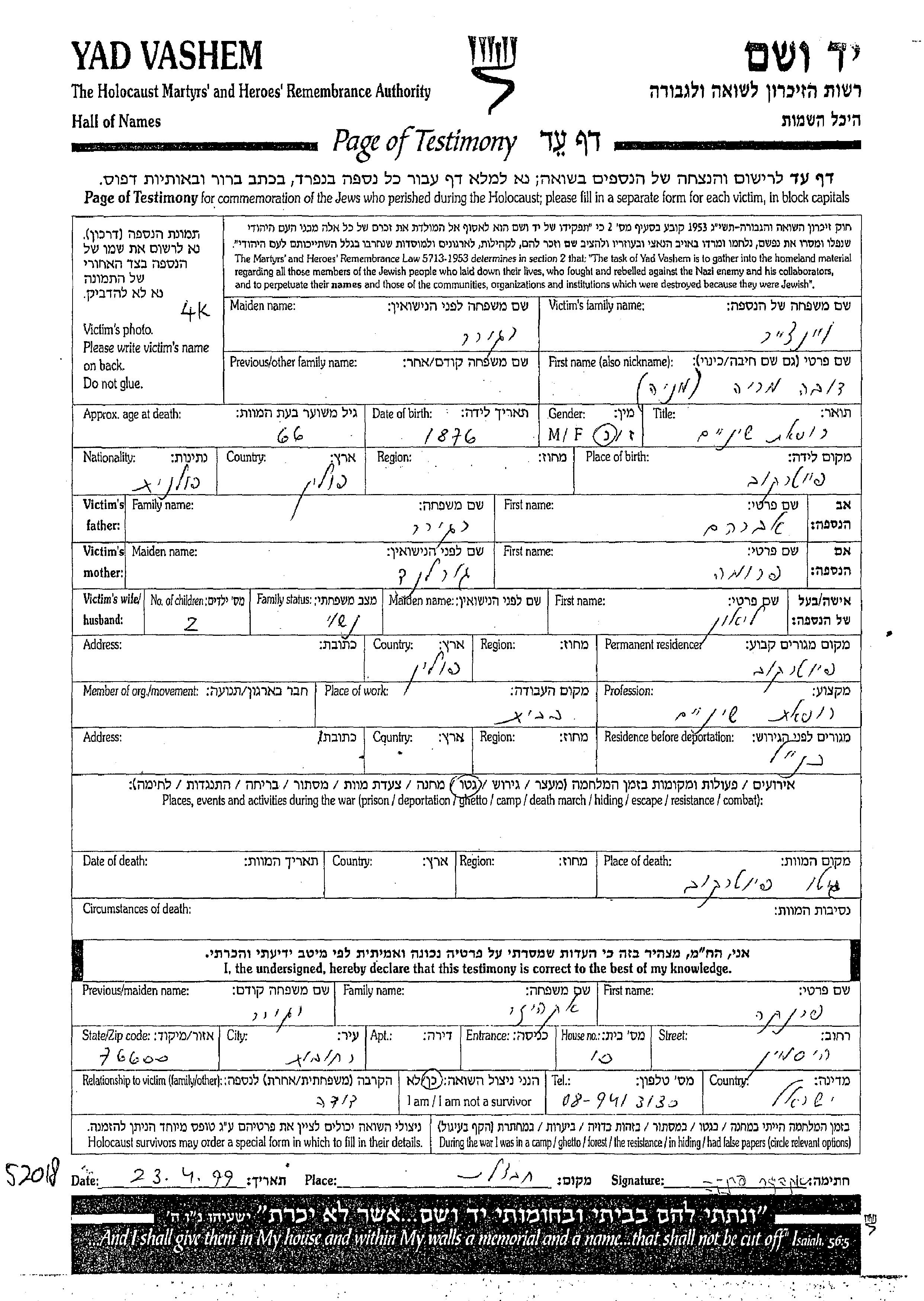 Yad Vashem - Pages of Testimony Names Memorial Collection