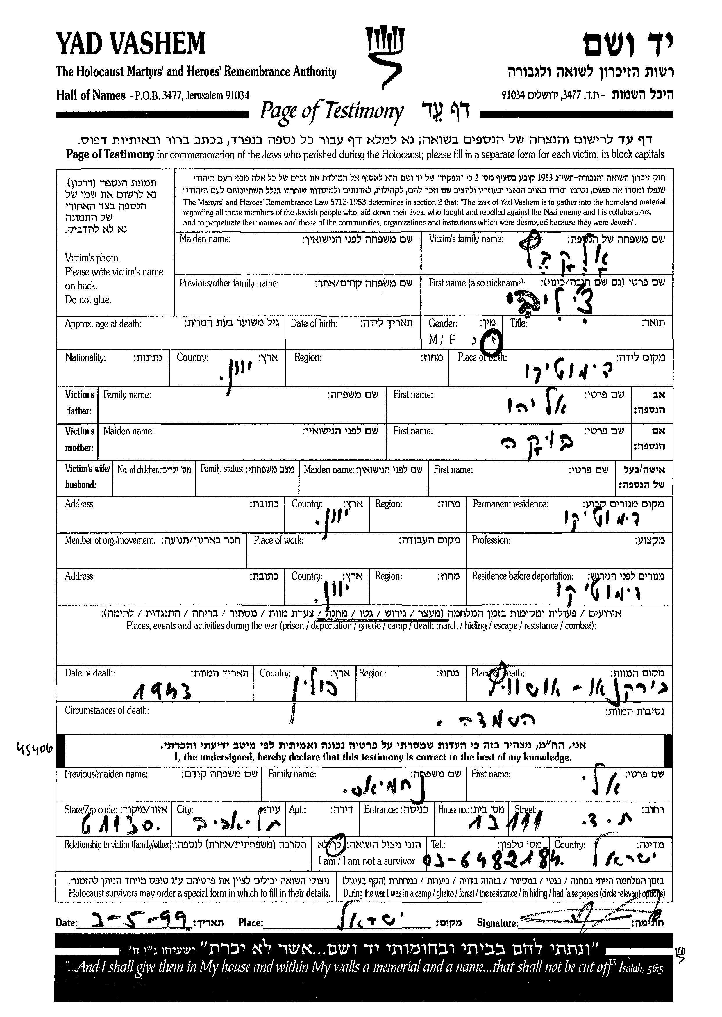 Yad Vashem - Pages of Testimony Names Memorial Collection