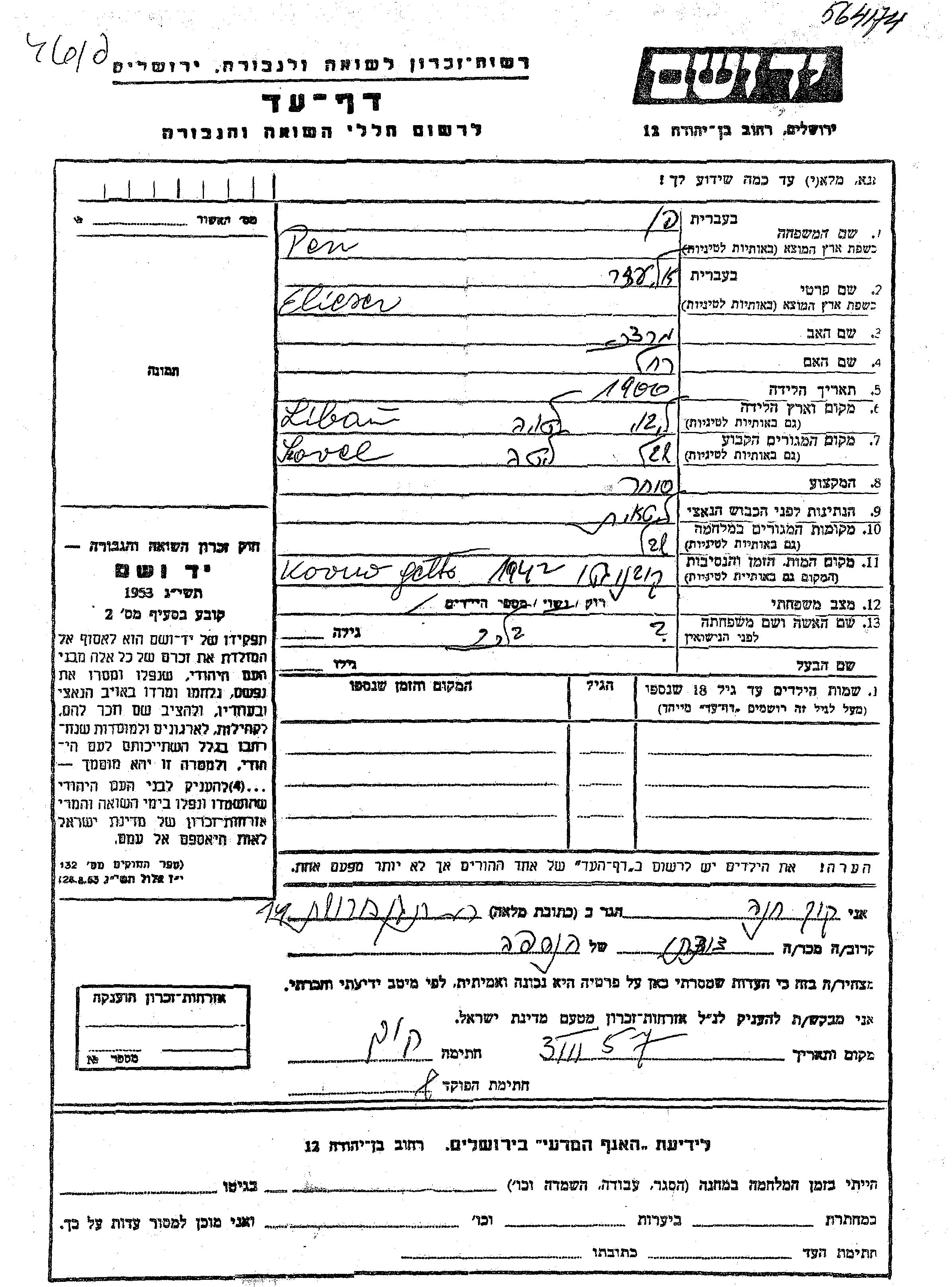 Pen Eliezer 1900 Šiauliai, Lituanie Feuille de témoignage