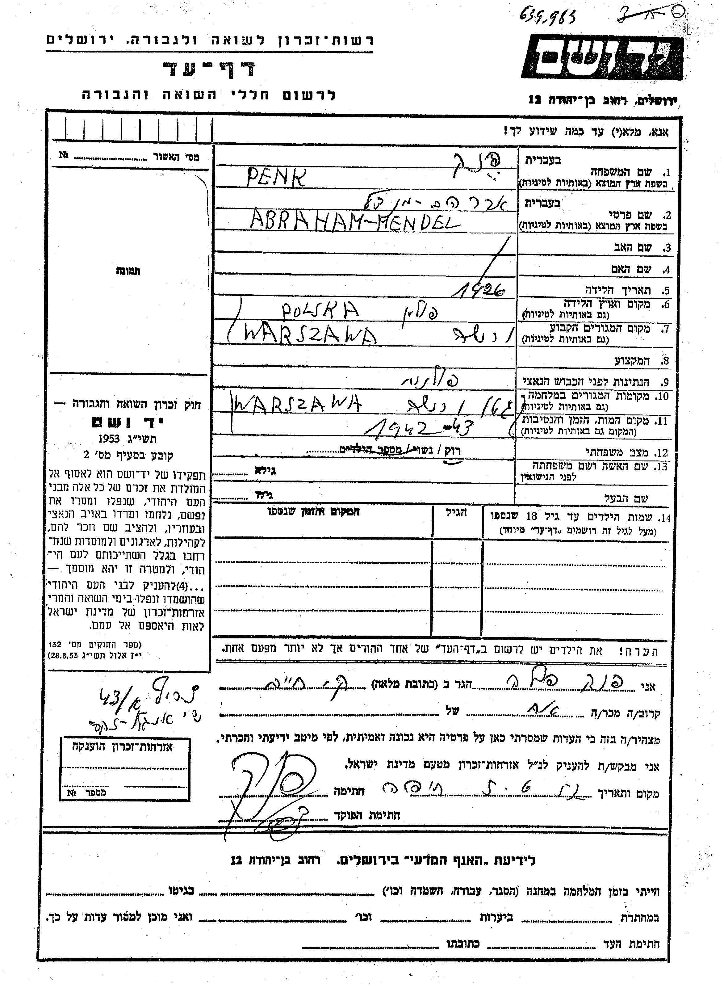 Penk Abraham Mendel 1926 Warszawa, Pologne Feuille de témoignage