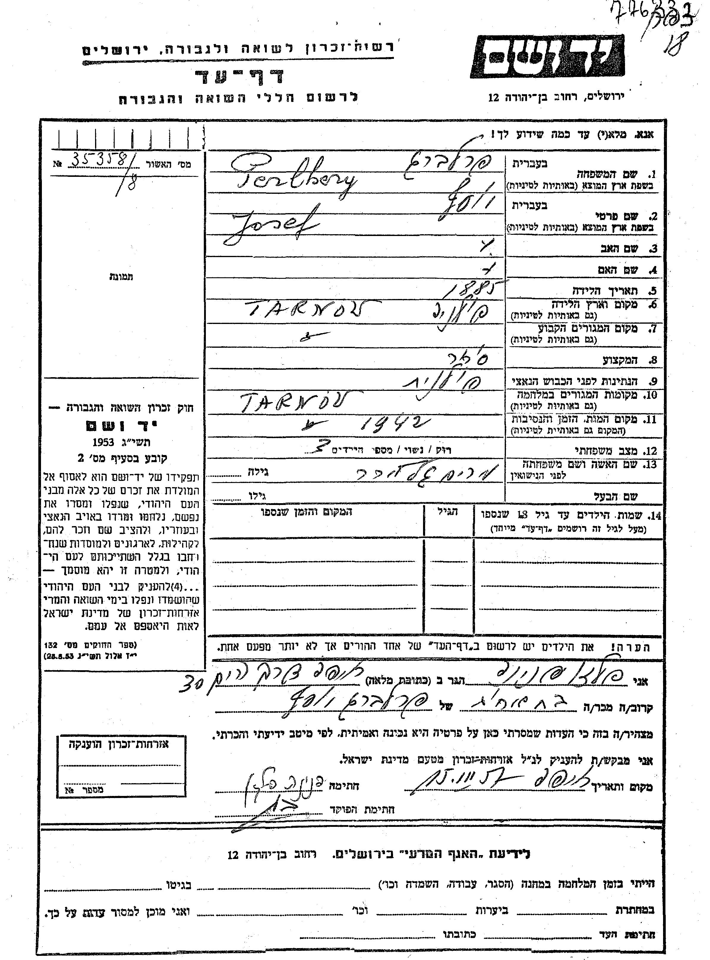 Yosef a été assassiné pendant la Shoah. Lieu de la mort: Tarnow, Pologne en 1942.