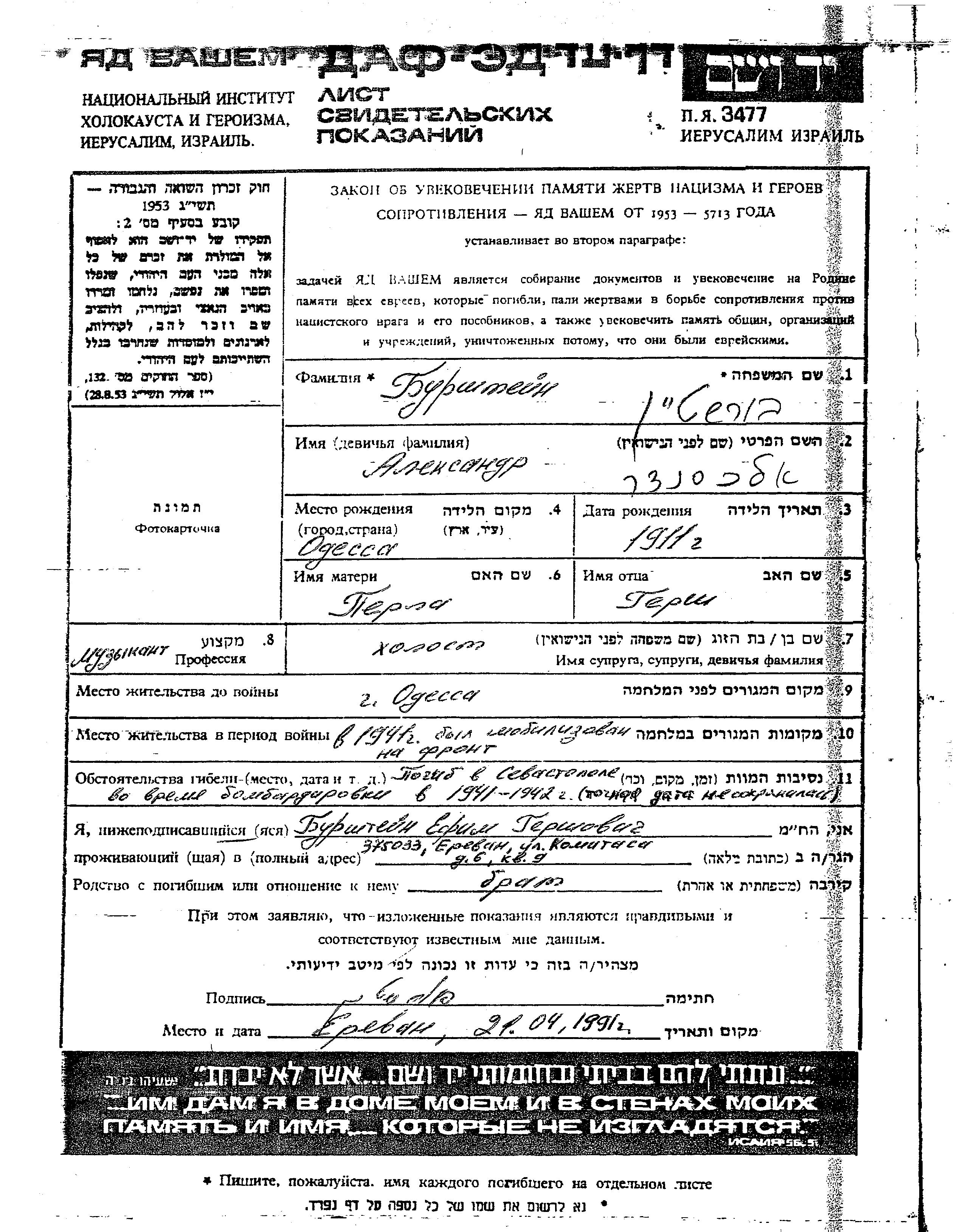 Burshtein Aleksandr 1911 Odessa, Ukraine (URSS) Feuille de témoignage
