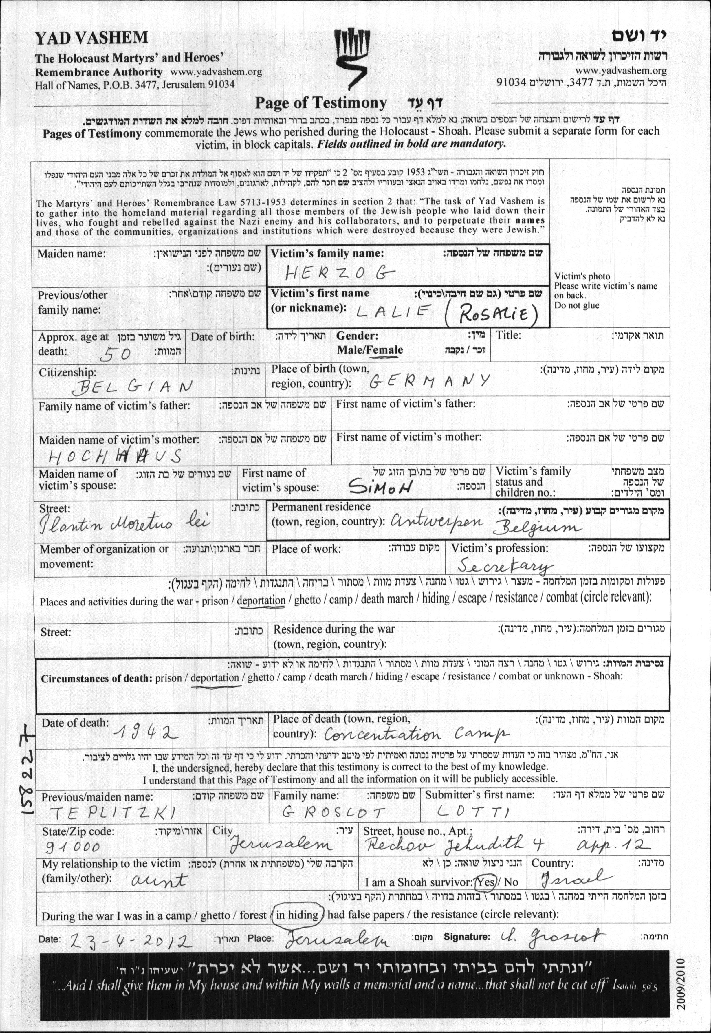 Herzog Lalie Rosalie Antwerpen, Belgique Feuille de témoignage