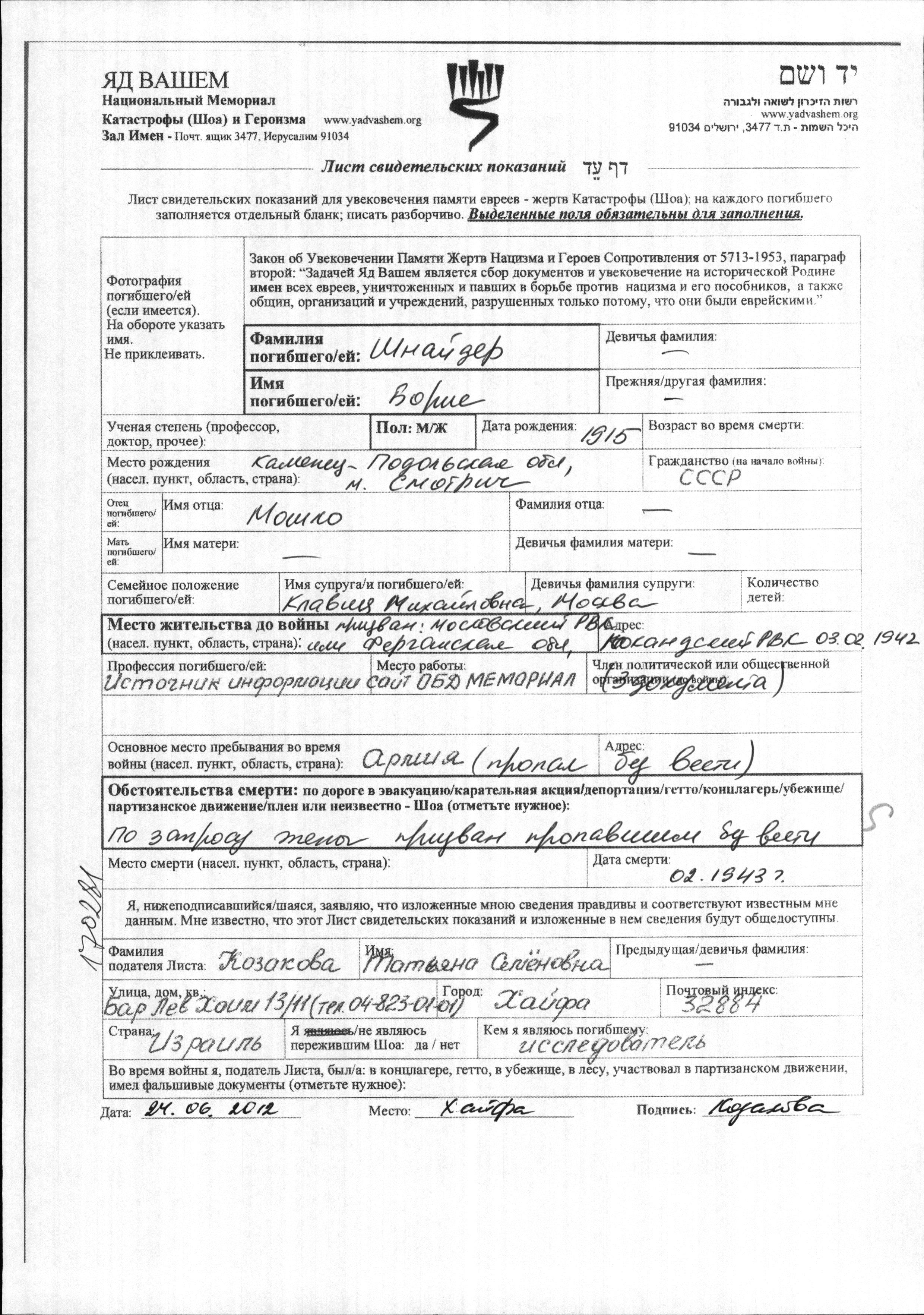 Shnayder Boris endroit inconnu, Feuille de témoignage