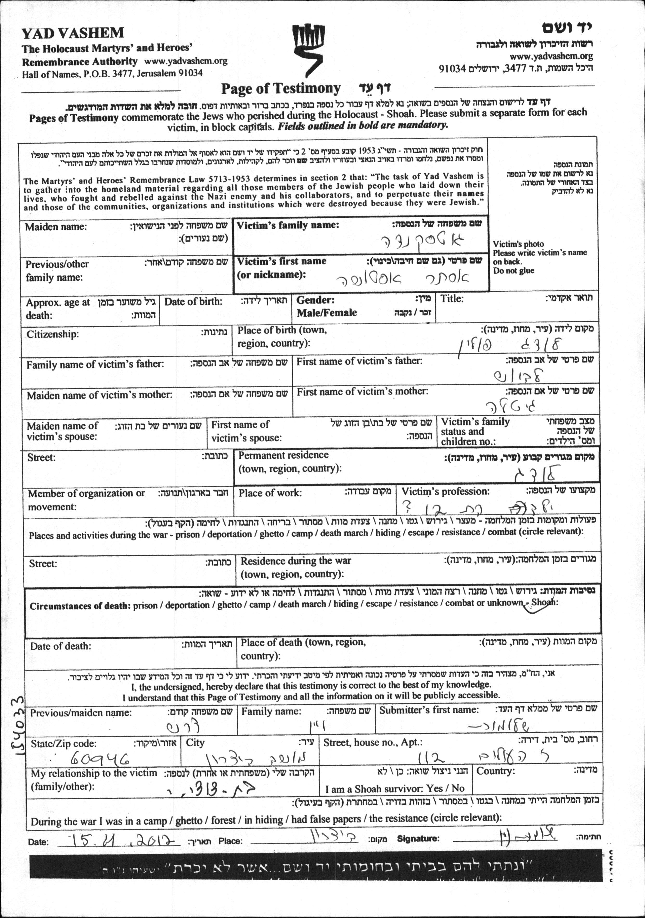 Yad Vashem - Pages of Testimony Names Memorial Collection