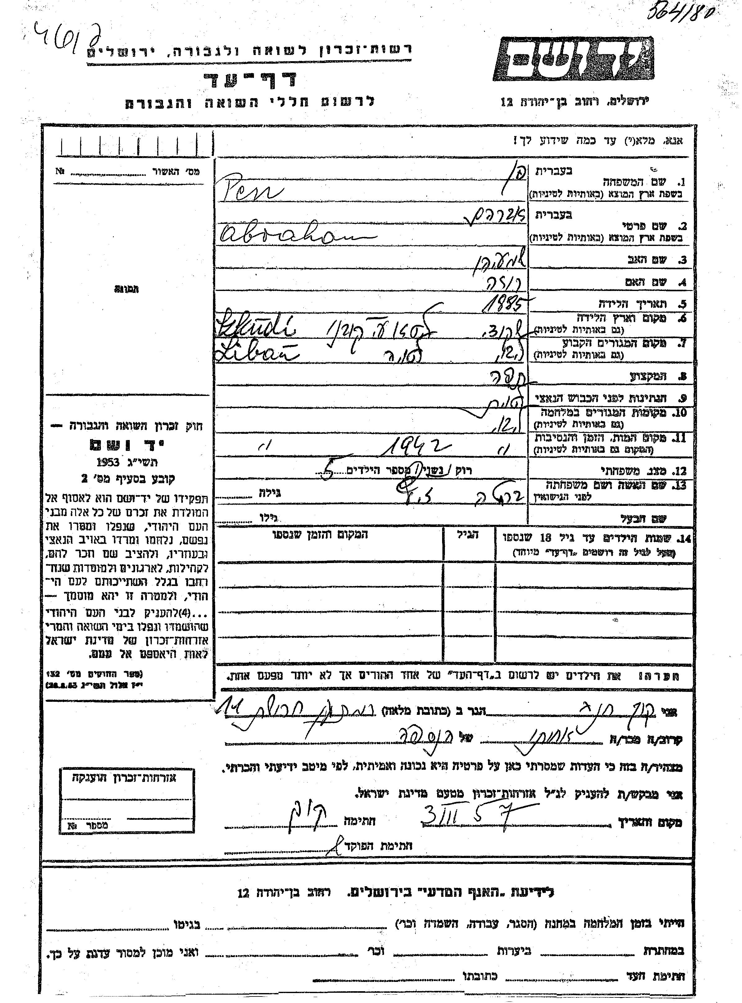 Abraham Pen est né à Szkudy, Lituanie en 1885, fils de Shmaiahu et de Roza. Il était Coupeur-tailleur et Mariée à Berta née Zitz. Avant la seconde guerre mondiale il vivait à Libau, Lettonie. Au cours de la guerre, il était à Libau, Lettonie.