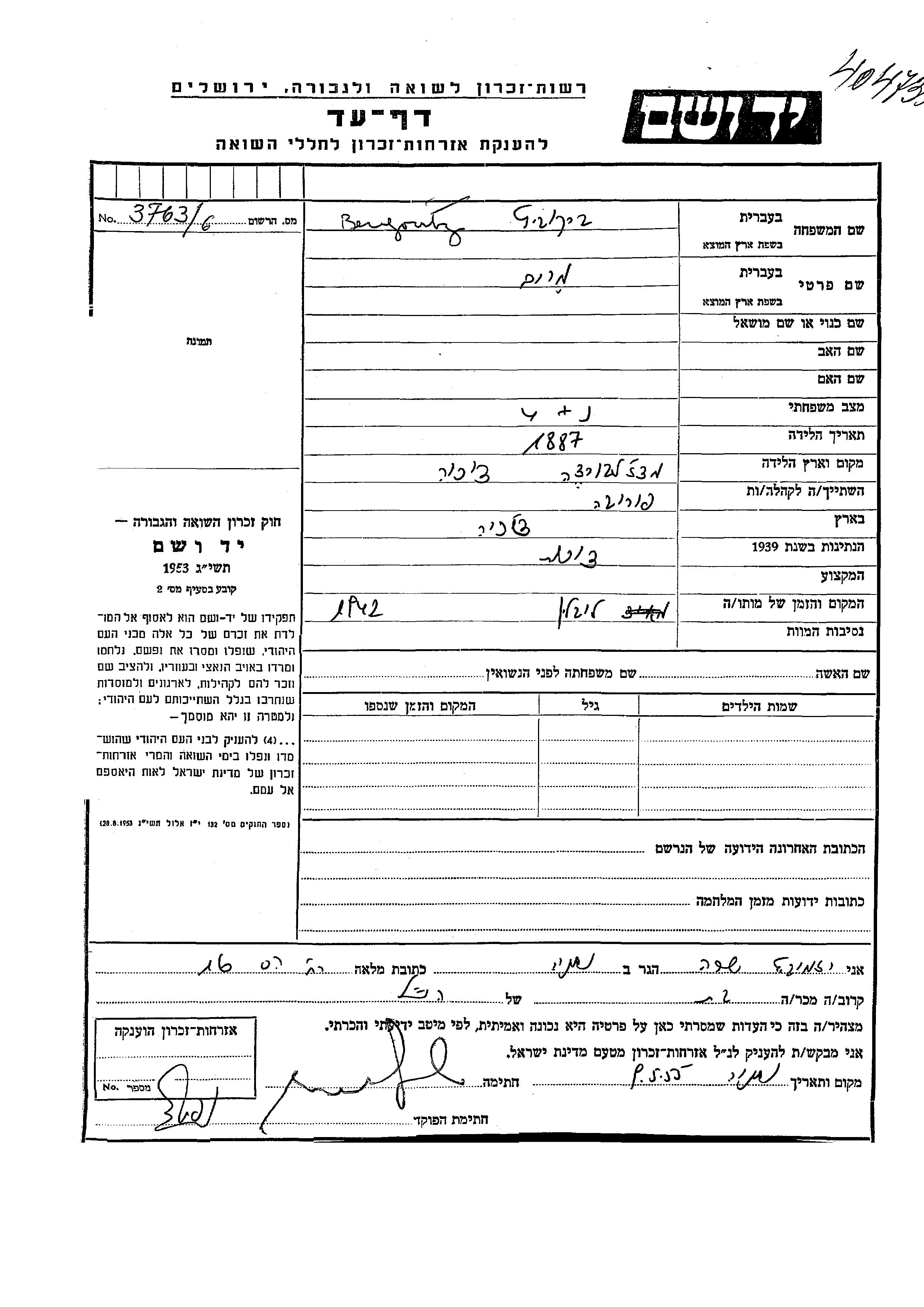 Berkovitz Miriam 1887 Poruba, Tchécoslovaquie Feuille de témoignage