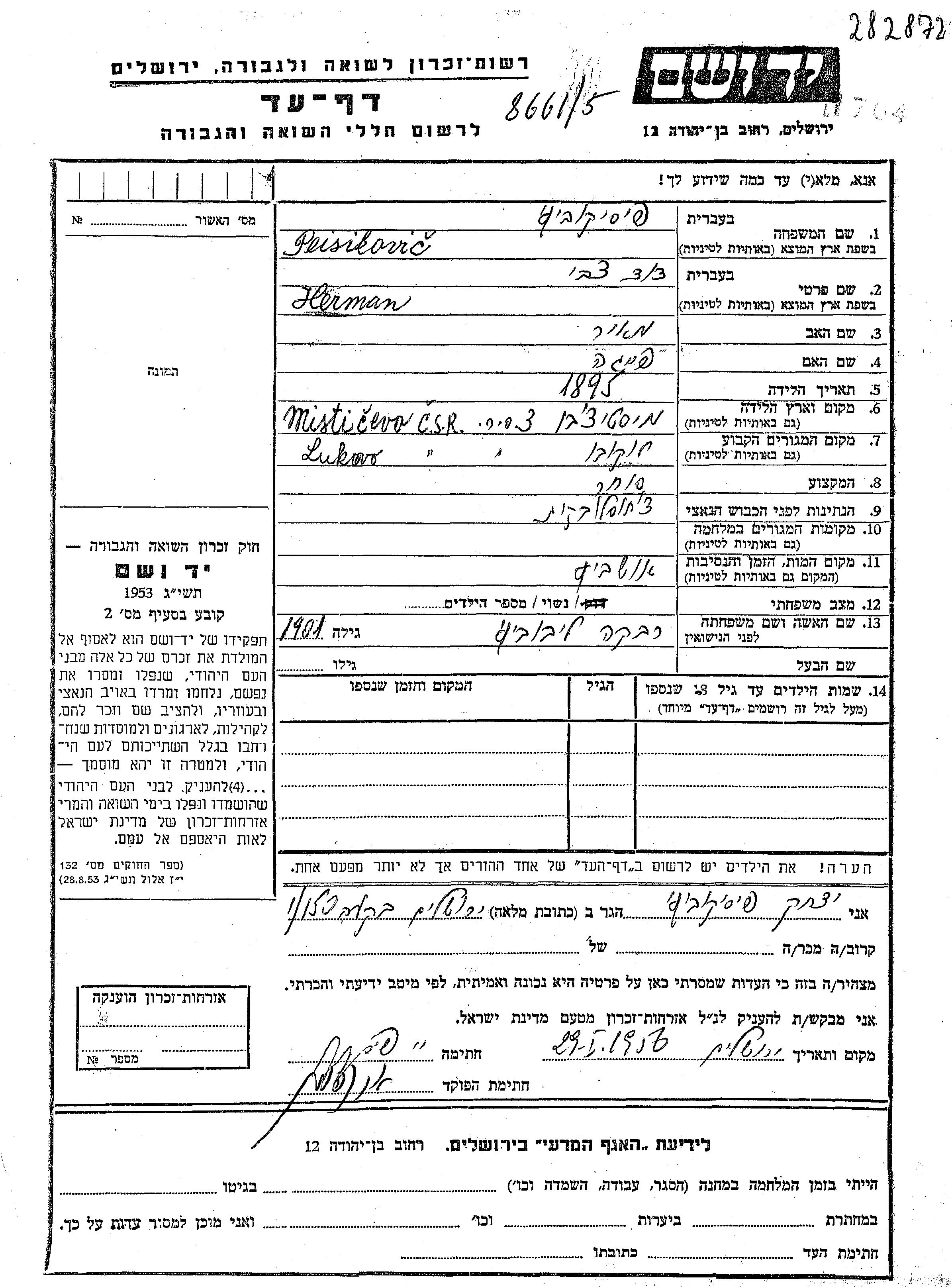 Peisikovic Herman David Tzvi 1895 Lukovo, Tchécoslovaquie Feuille de témoignage