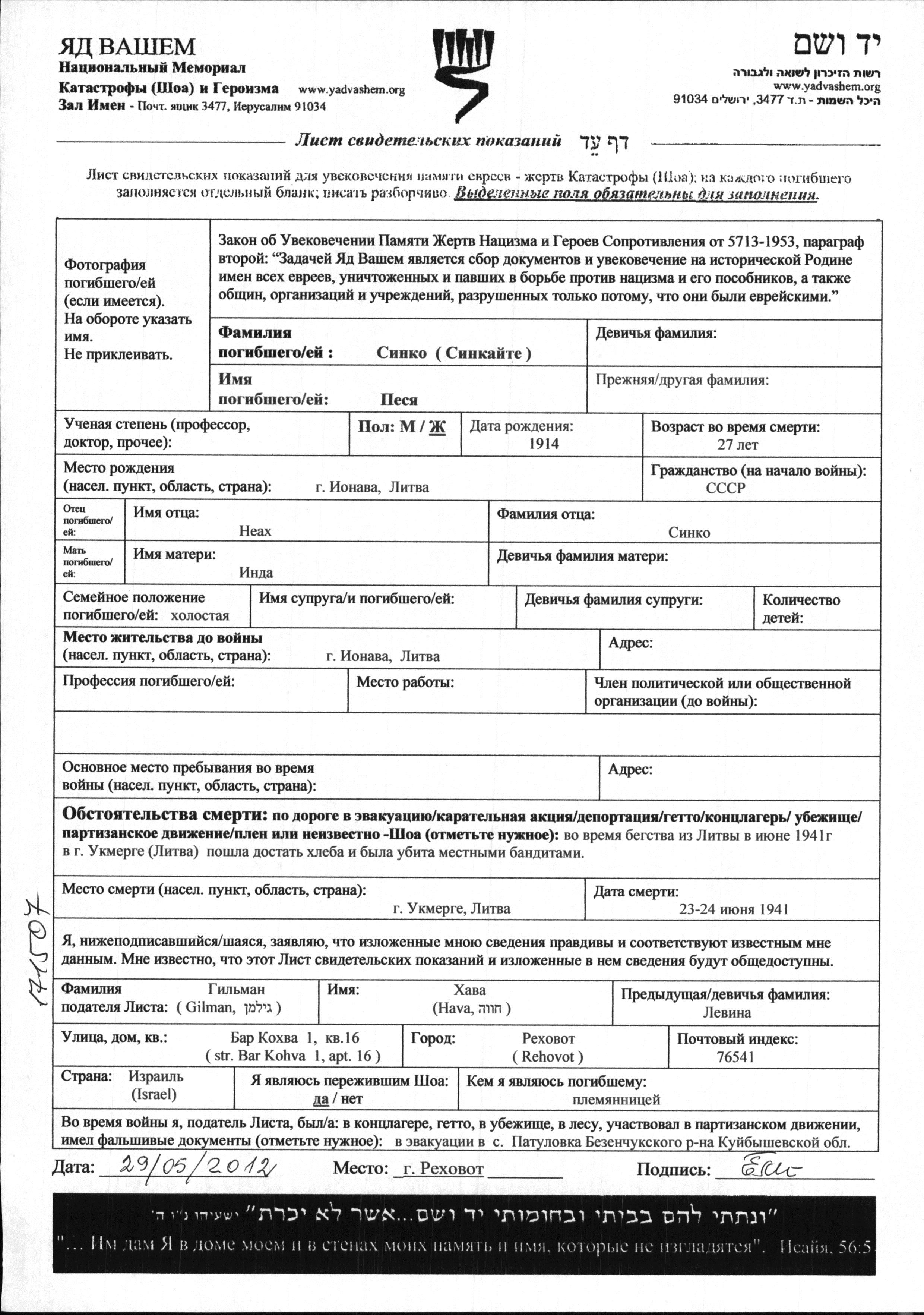 Sinko Pesya 1914 Ionava, Lituanie Feuille de témoignage