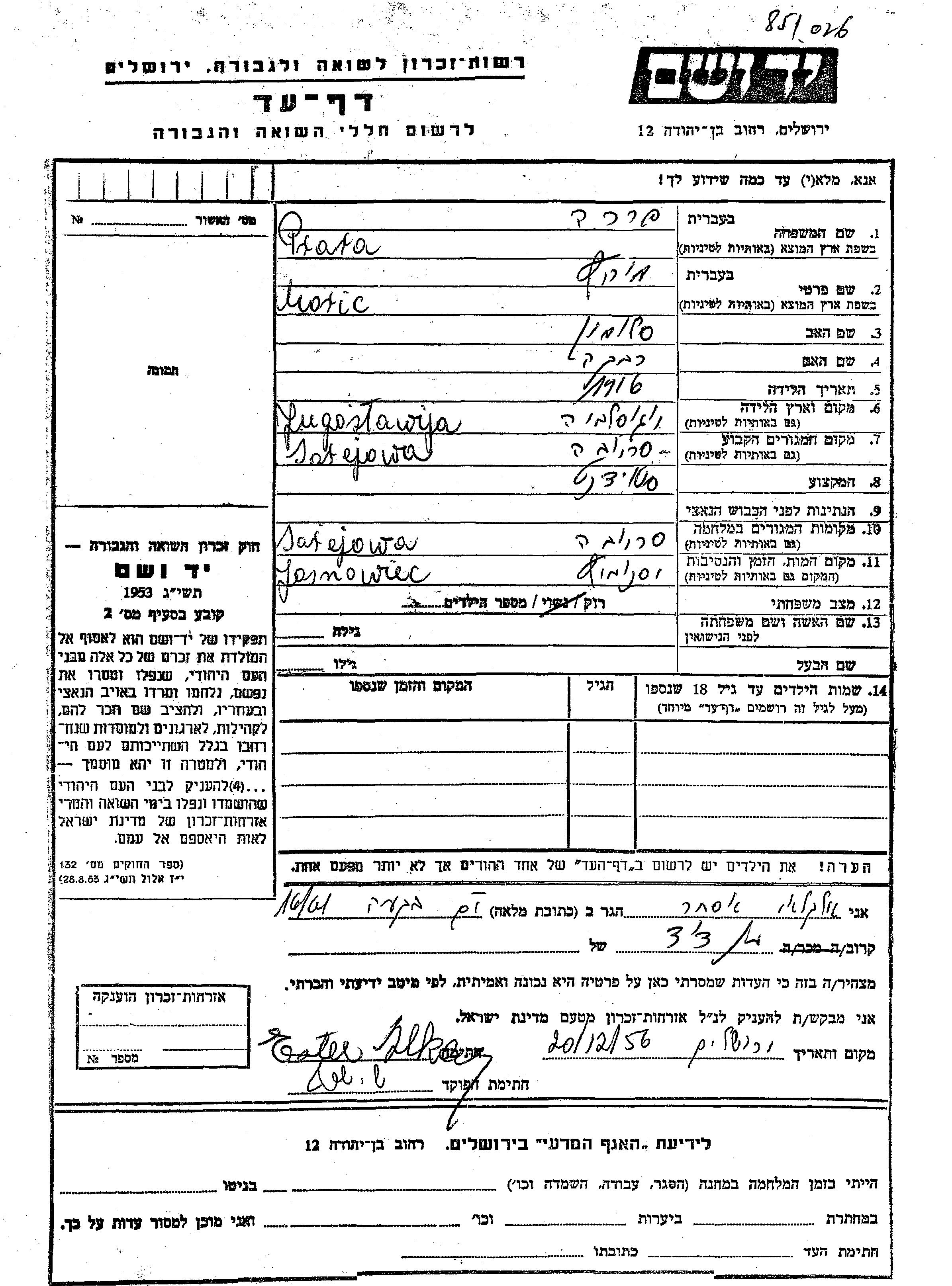 Yad Vashem - Pages of Testimony Names Memorial Collection