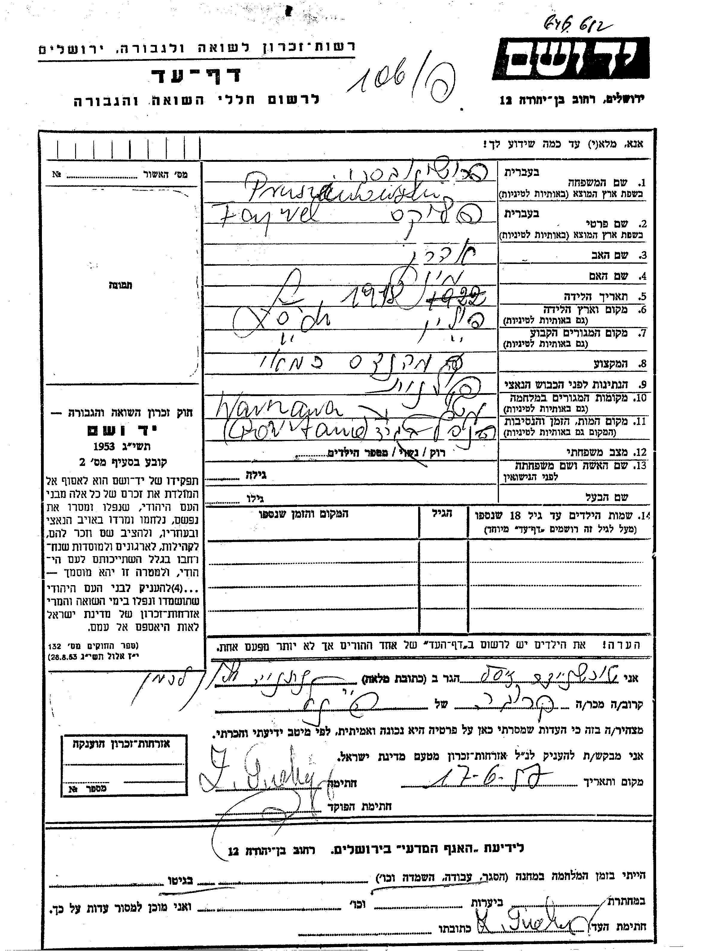 Pruszinowski Fajvel Feliks 1918 Lodz, Pologne Feuille de témoignage