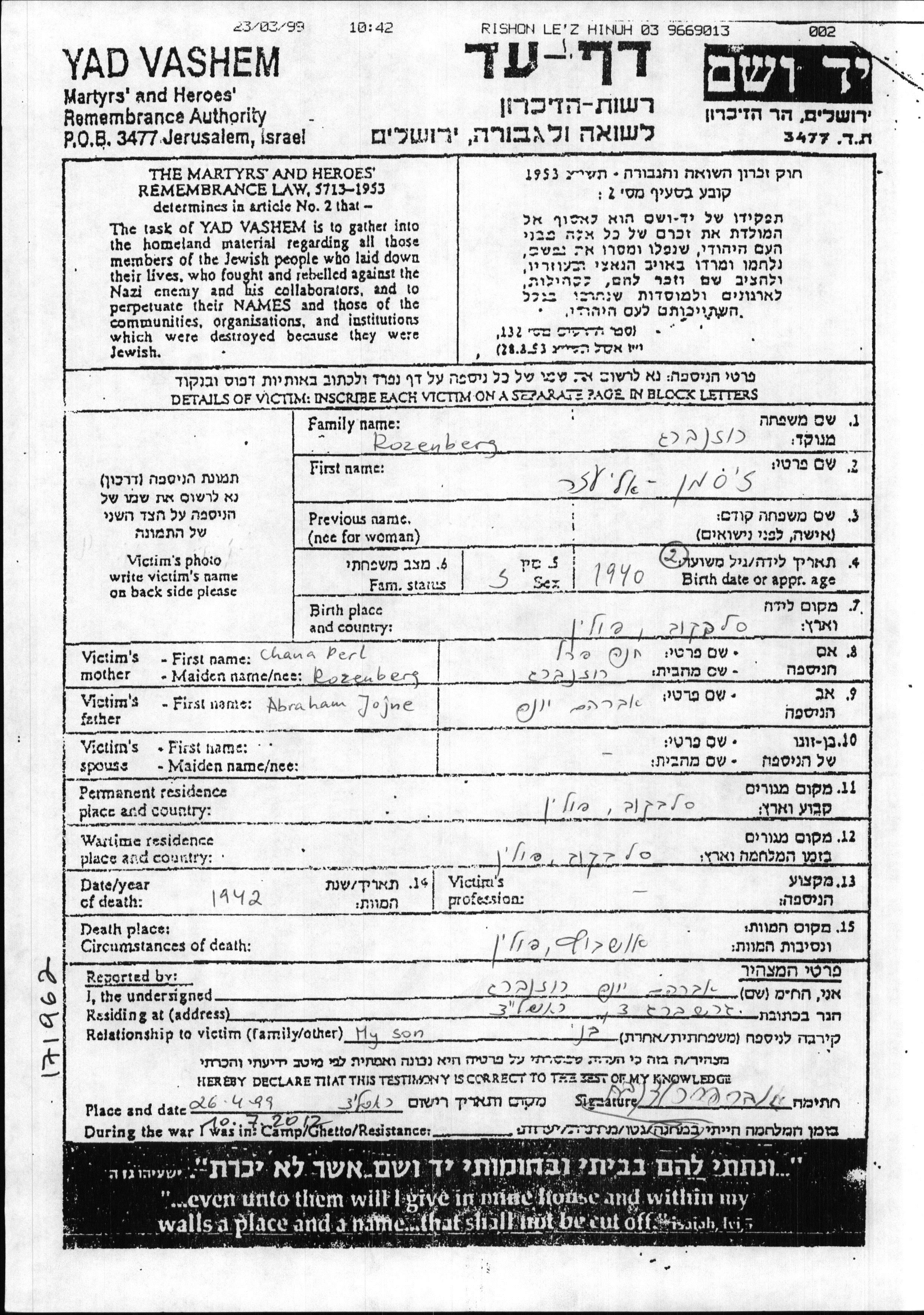 Rozenberg Zisman Eliezer 1940 Slawkow, Pologne Feuille de témoignage