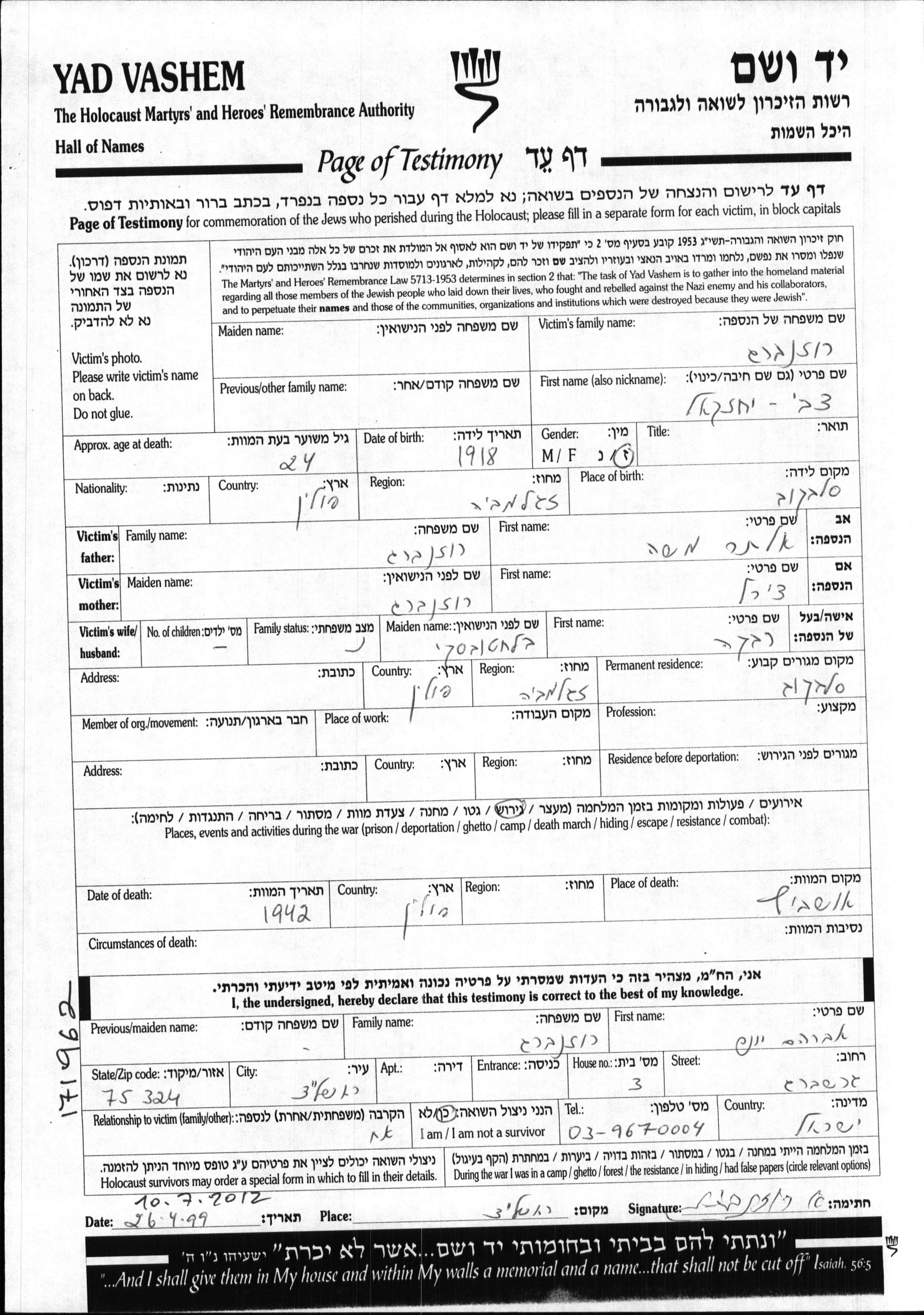 Yad Vashem - Pages of Testimony Names Memorial Collection