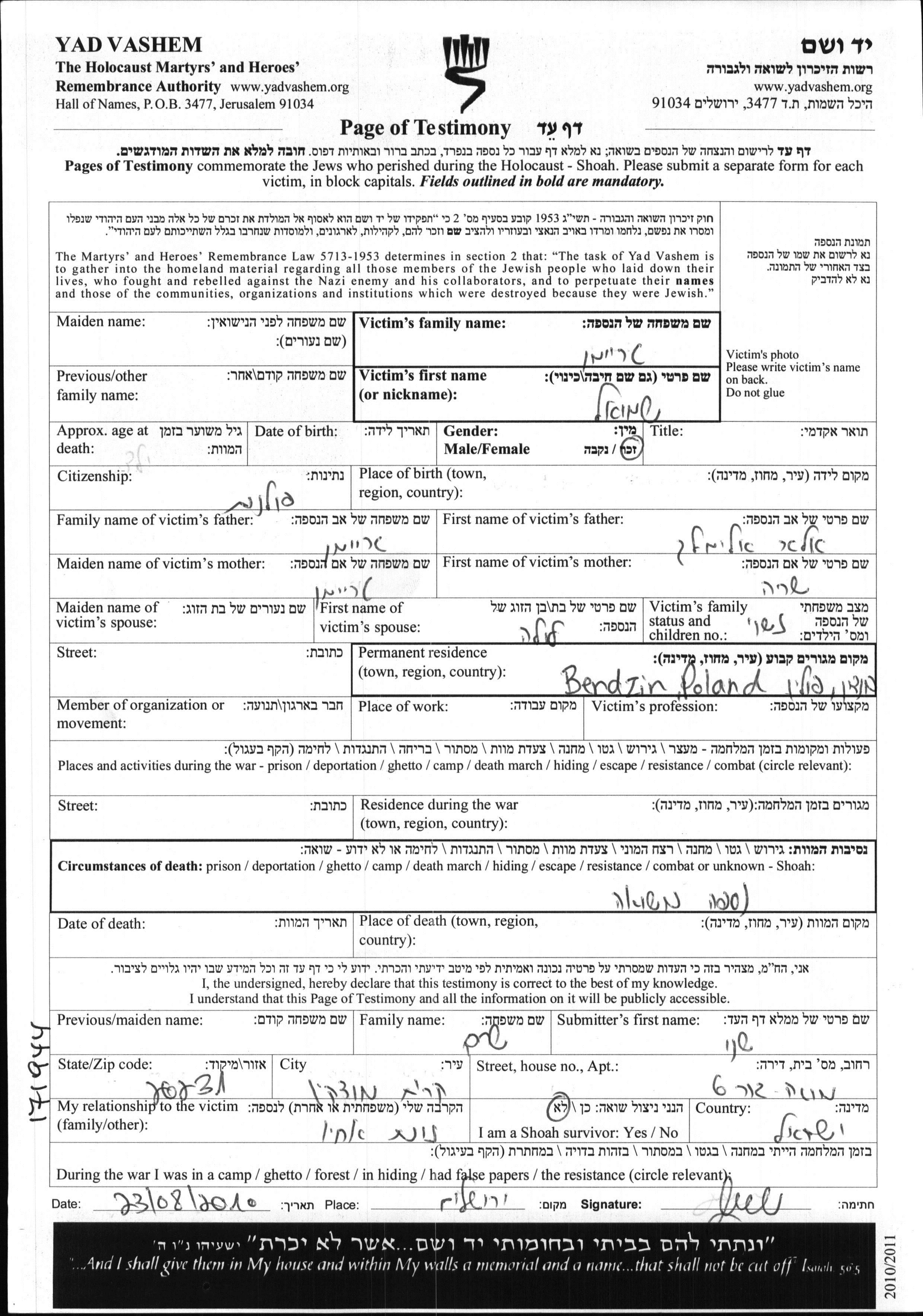 Treiman Shmuel Bendzin, Pologne Feuille de témoignage
