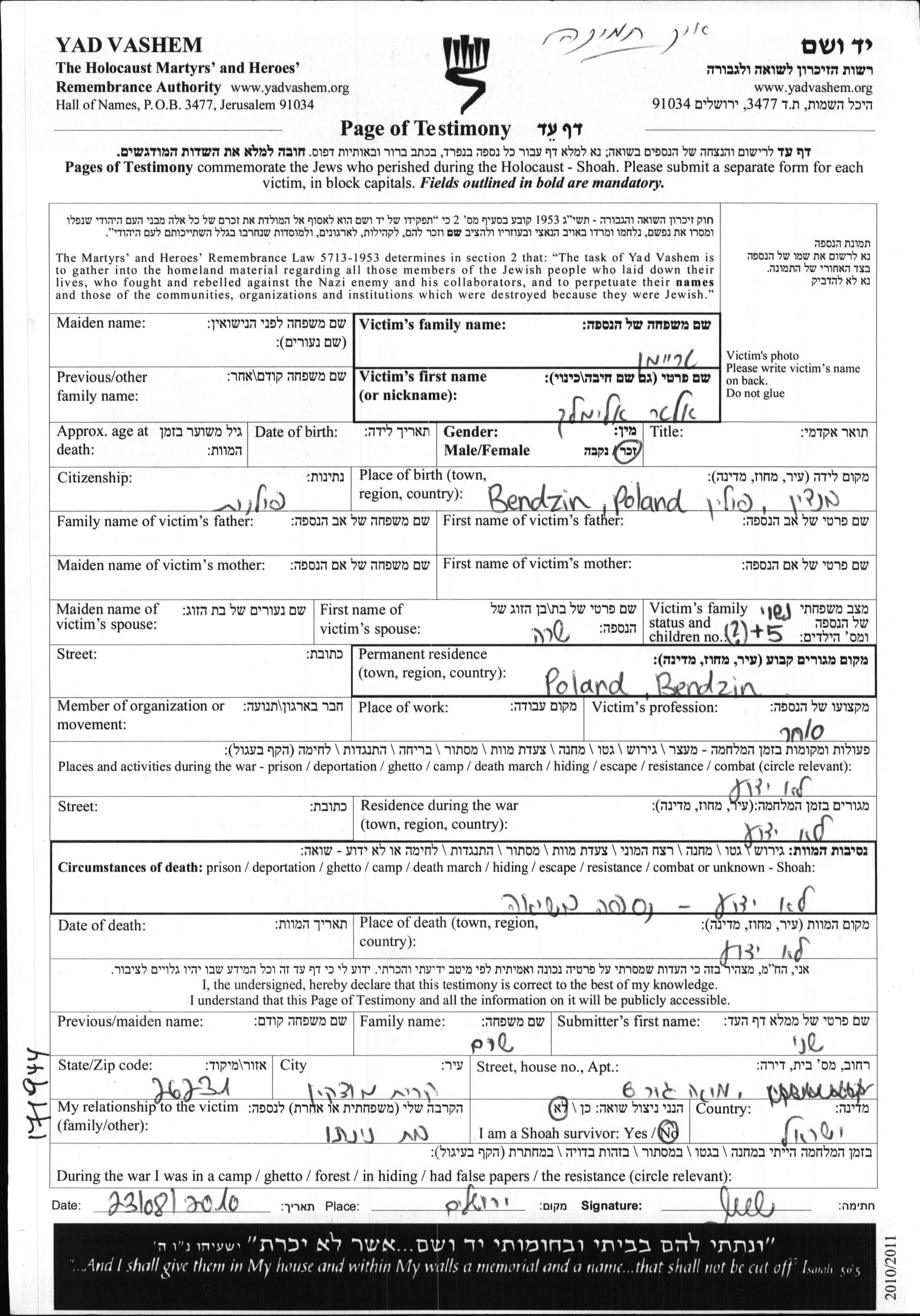 Treiman Alter Elimelekh Bendzin, Pologne Feuille de témoignage