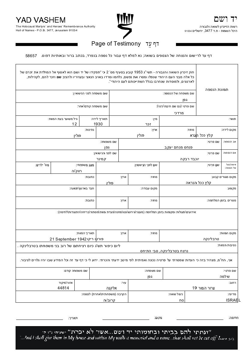 Gefen Mordekhai 1930 Kielce, Pologne Feuille de témoignage (digitale)
