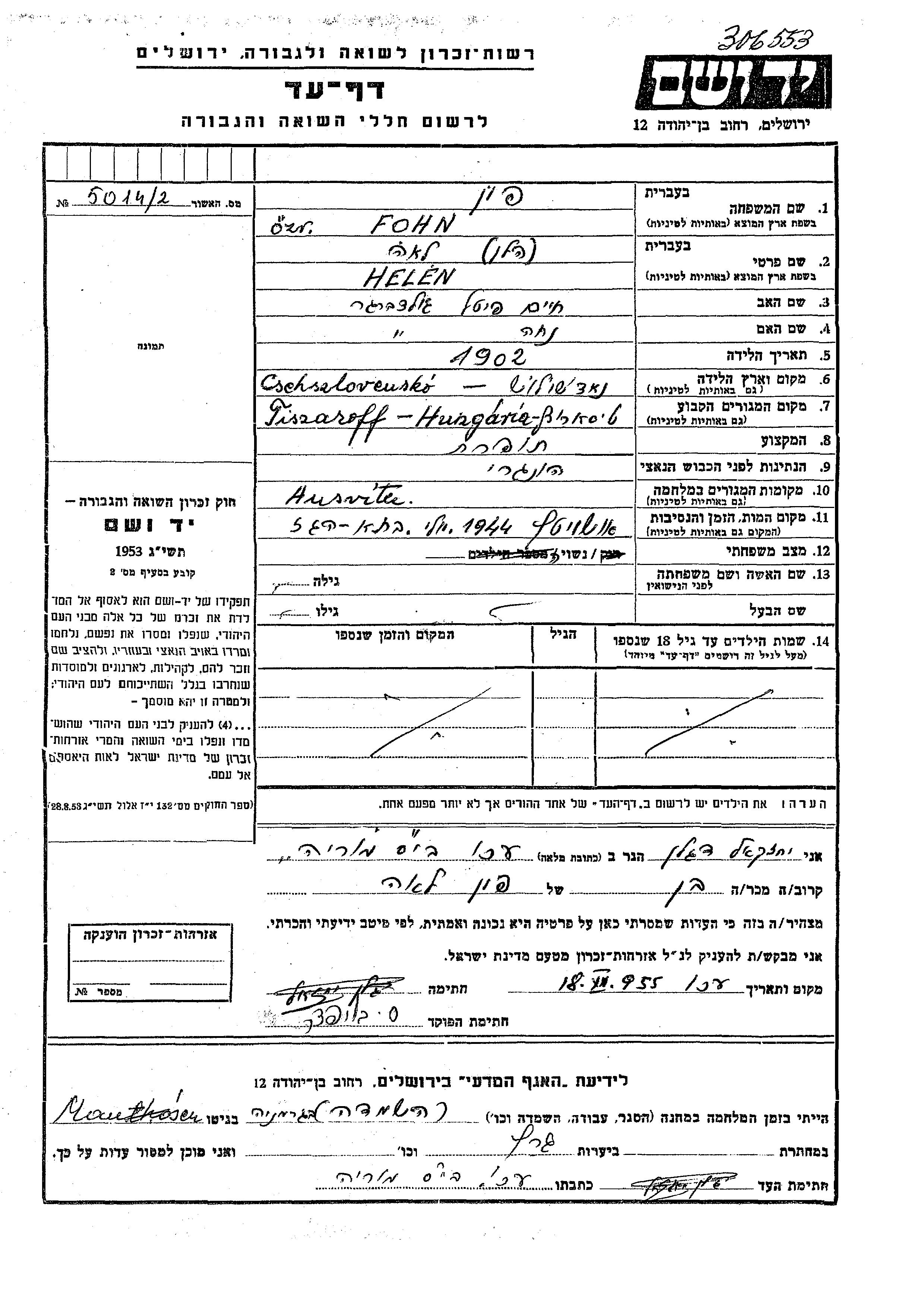 Fohn Pun Lea Helen 1902 Tiszaroff, Hongrie Feuille de témoignage