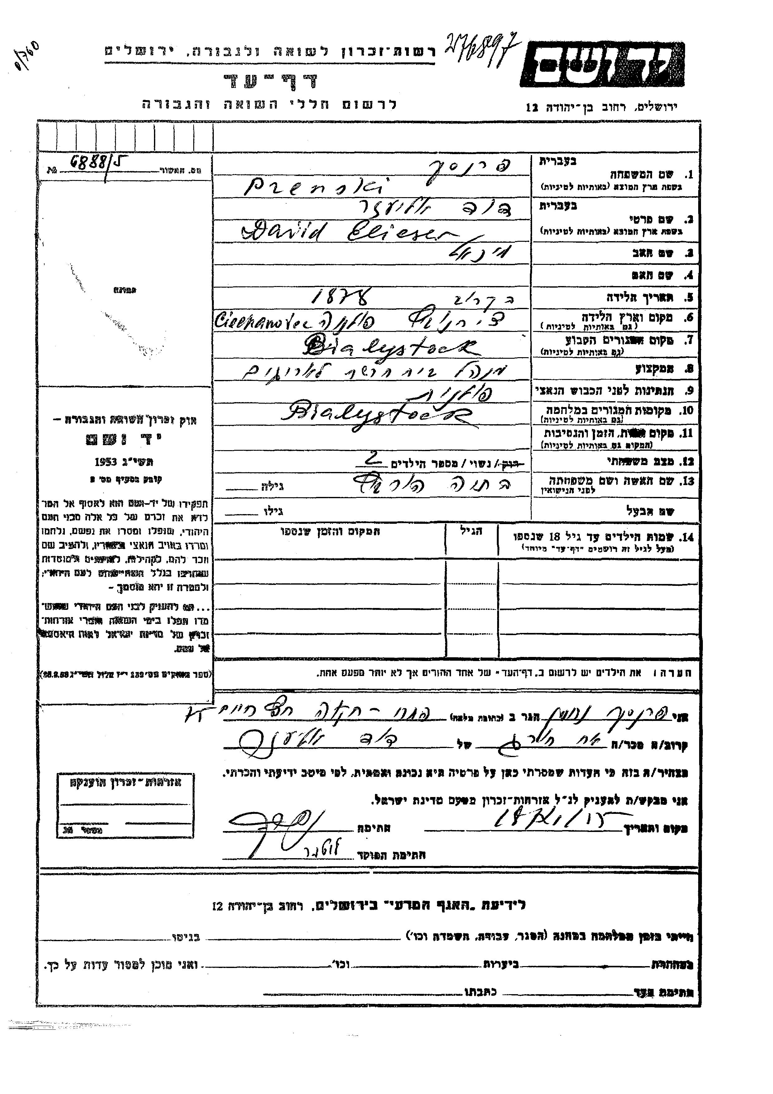 Prenski Elieser David 1878 Bialistok, Pologne Feuille de témoignage