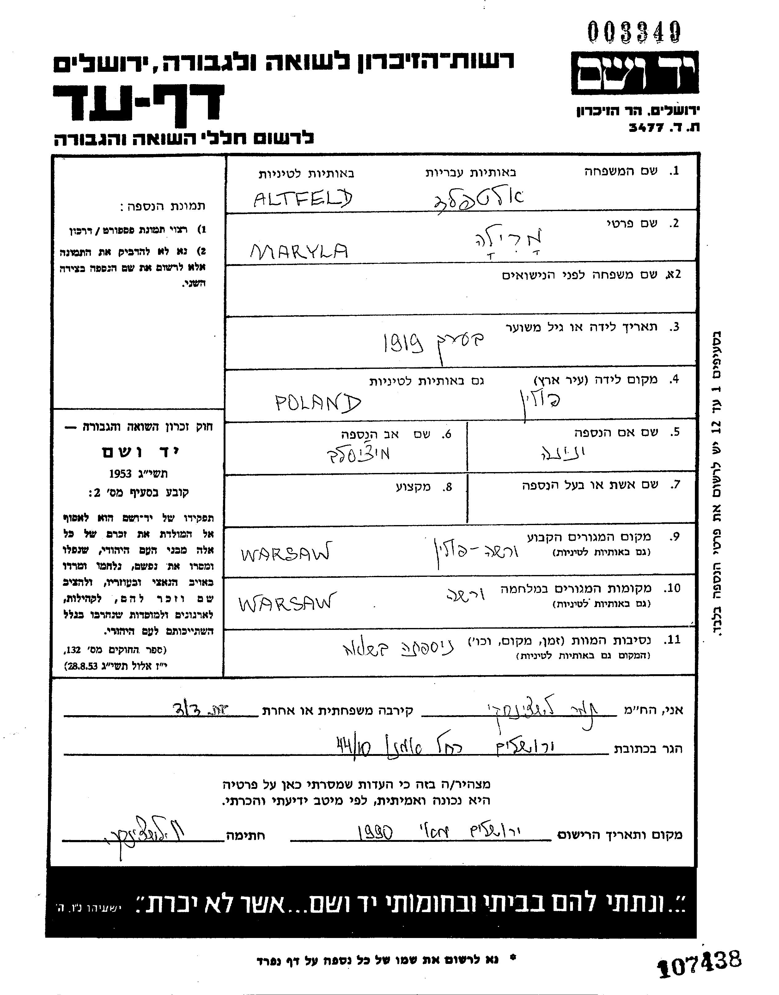Altfeld Maryla 1919 Warszawa, Pologne Feuille de témoignage