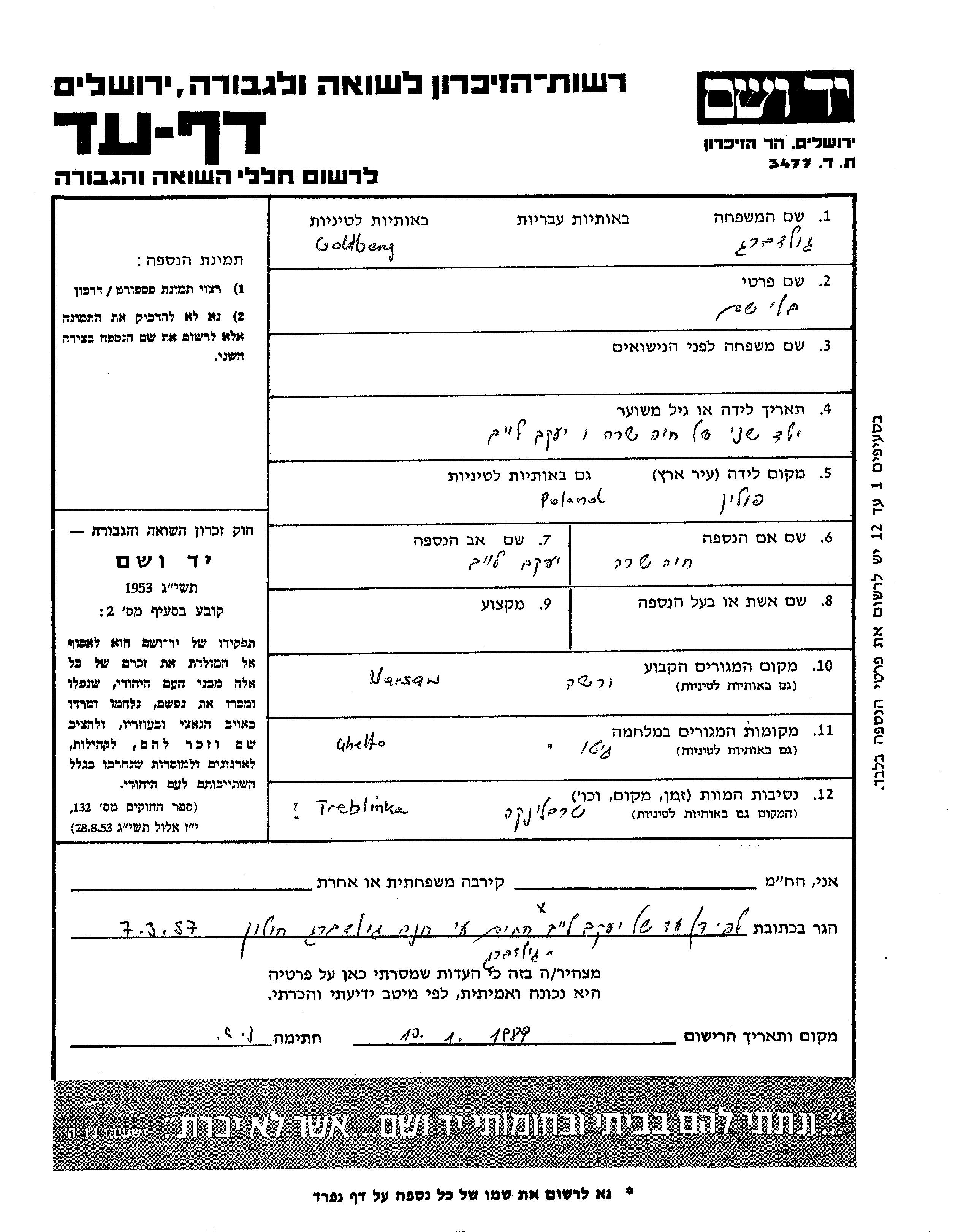 Goldberg prénom inconnu Warszawa, Pologne Feuille de témoignage