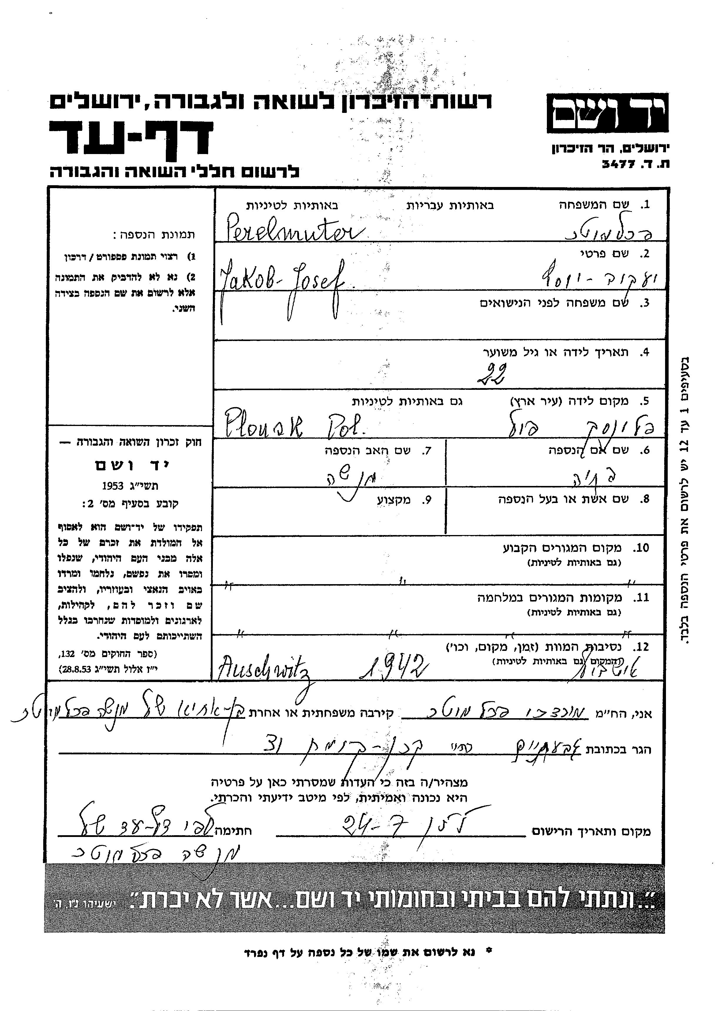 Perelmuter Jakob Yosef Plousk, Pologne Feuille de témoignage