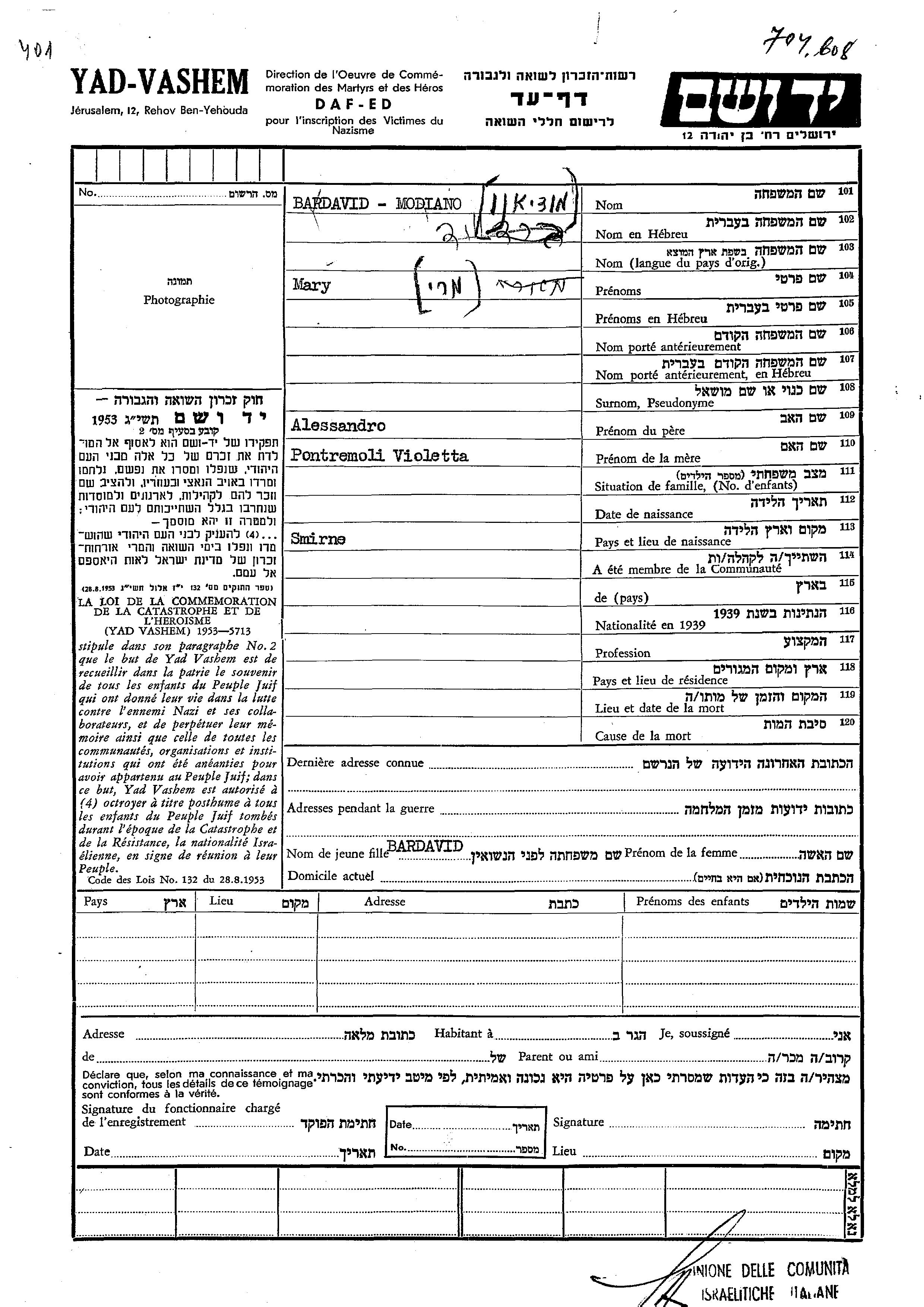 Modiano Bardavid Mary endroit inconnu, Feuille de témoignage